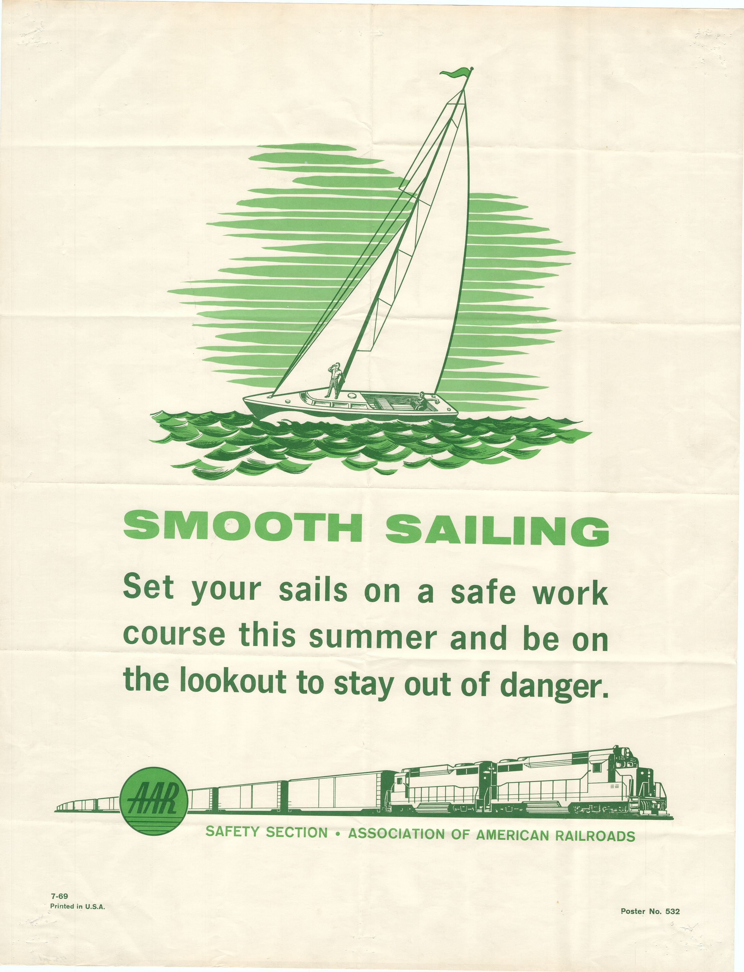 A poster telling railroad employees to work safely, 17" x 22," 1969. The poster was issued by the Safety Section of the Association of American Railroads (AAR). A drawn picture of a sail boat with two passengers, printed with green ink, is featured. The message reads,