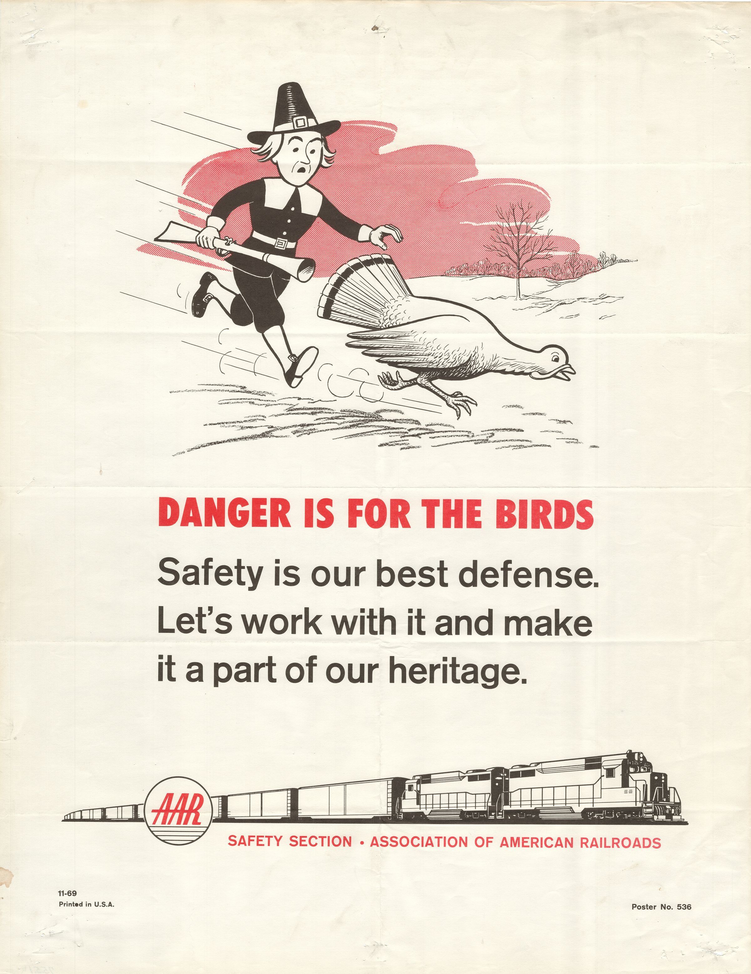 A Thanksgiving-themed cartoon picture of a pilgrim with a musket chasing a turkey in a snowy landscape is featured. A train with the AAR logo is at the bottom of the poster.