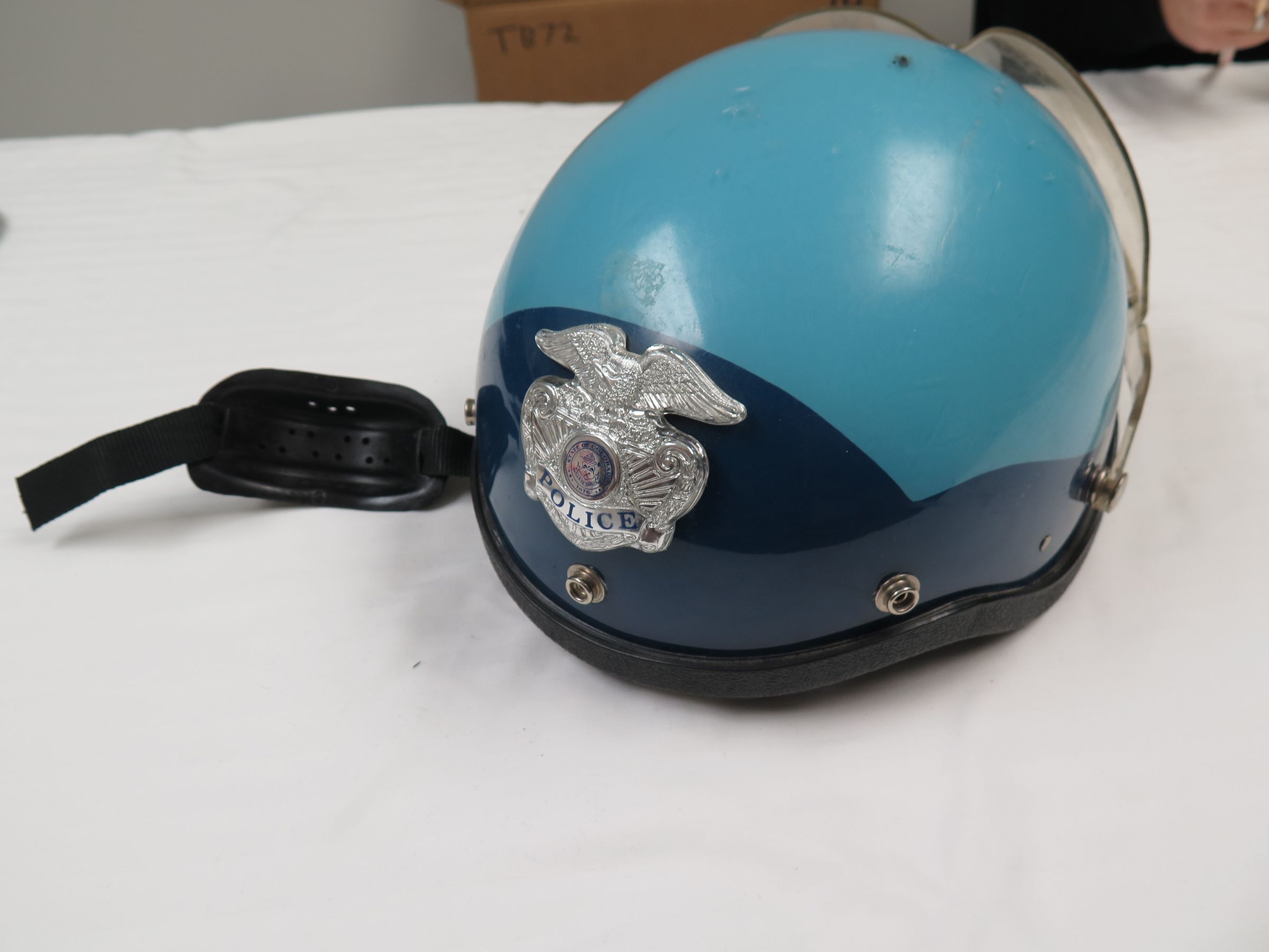 This is a Police riot helmet with goggles. The helmet is light blue on the top and darker blue underneath. The helmet measures 7" (h) x 9" (w) x 11" (d).