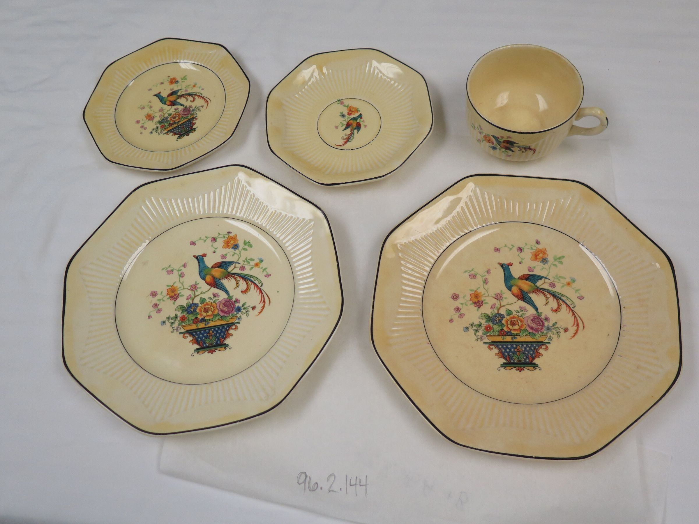 This is a set of yellow dishes with the image of a bird. The set includes 2 large 0.5" (h) x 8.5" (dia) plates, a 0.5" (h) x 6" (dia) small plate, a 0.5" (h) x 5.75" (dia) saucer, and a 2" (h) x 4.5" (w) x 3.5" (d) cup.Collection