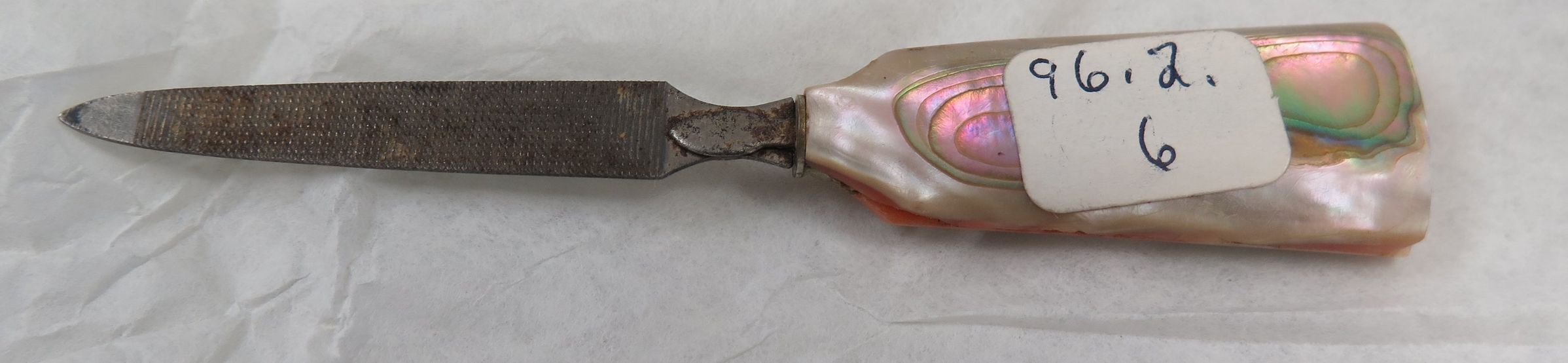 This metal nail file 3"(L) has a mother-of-pearl handle. Set of 2, nail file, and nail scraper with mother of pearl handles. File in 1996.2.6a, scraper is 1996.2.6b. Additional nail scraper found with number 1996.2.19 possibly part of the same set but with separate number not found in system.Collection