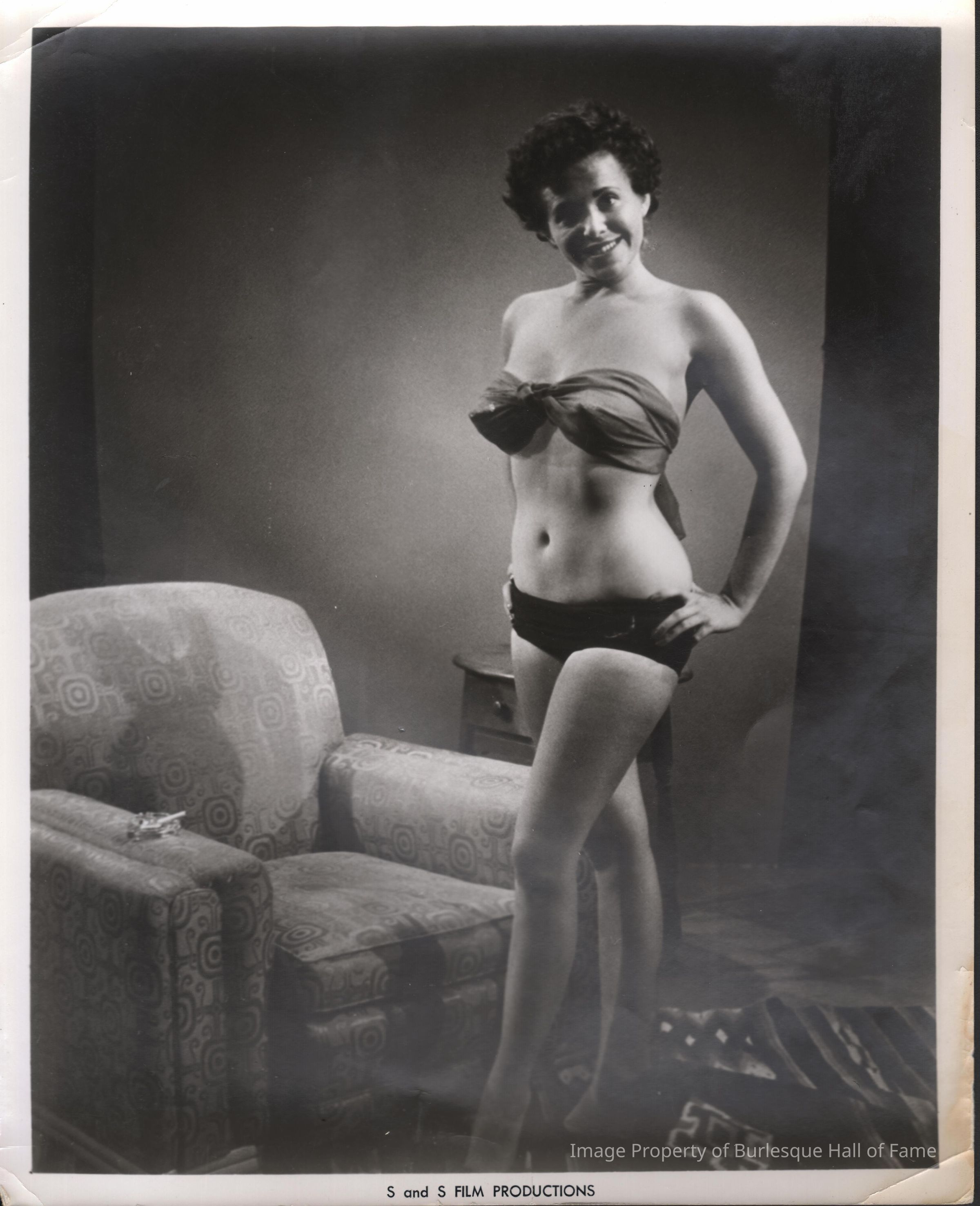 Photo - Gloria Flum B&W sheer bra wrap with visible pasties and panty "S&S Film productions