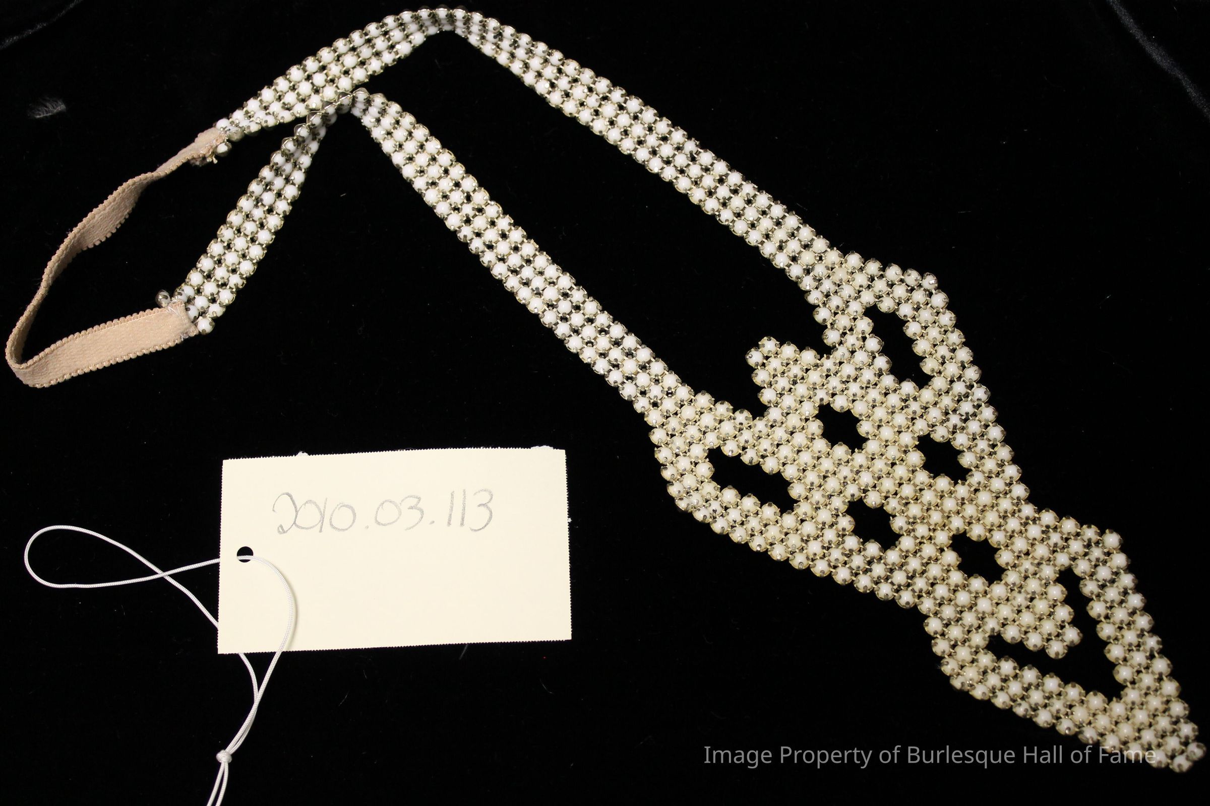 Costume - Jewelry - necklace-brass-white rhinestones in geometric pattern, peach ribbon back