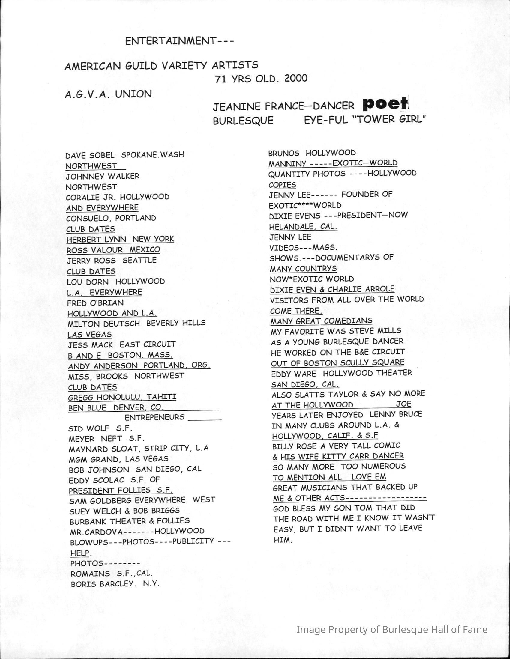 Costume - Resume- Jeanine France AGVA, 2000 ( 2 copies)