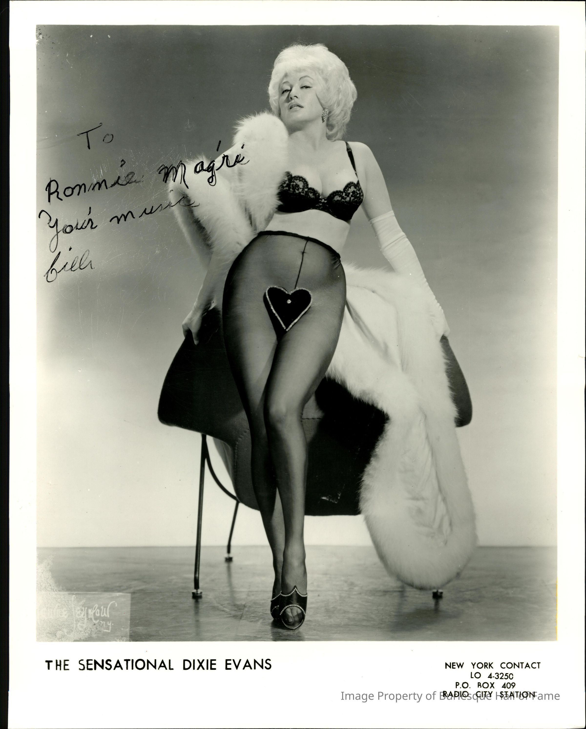 Photo - Dixie Evans B+W signed to Ronnie Magre, Maurice Seymour Studio, NY Contact info, The Sensational Dixie Evans, heart merkin, white fur