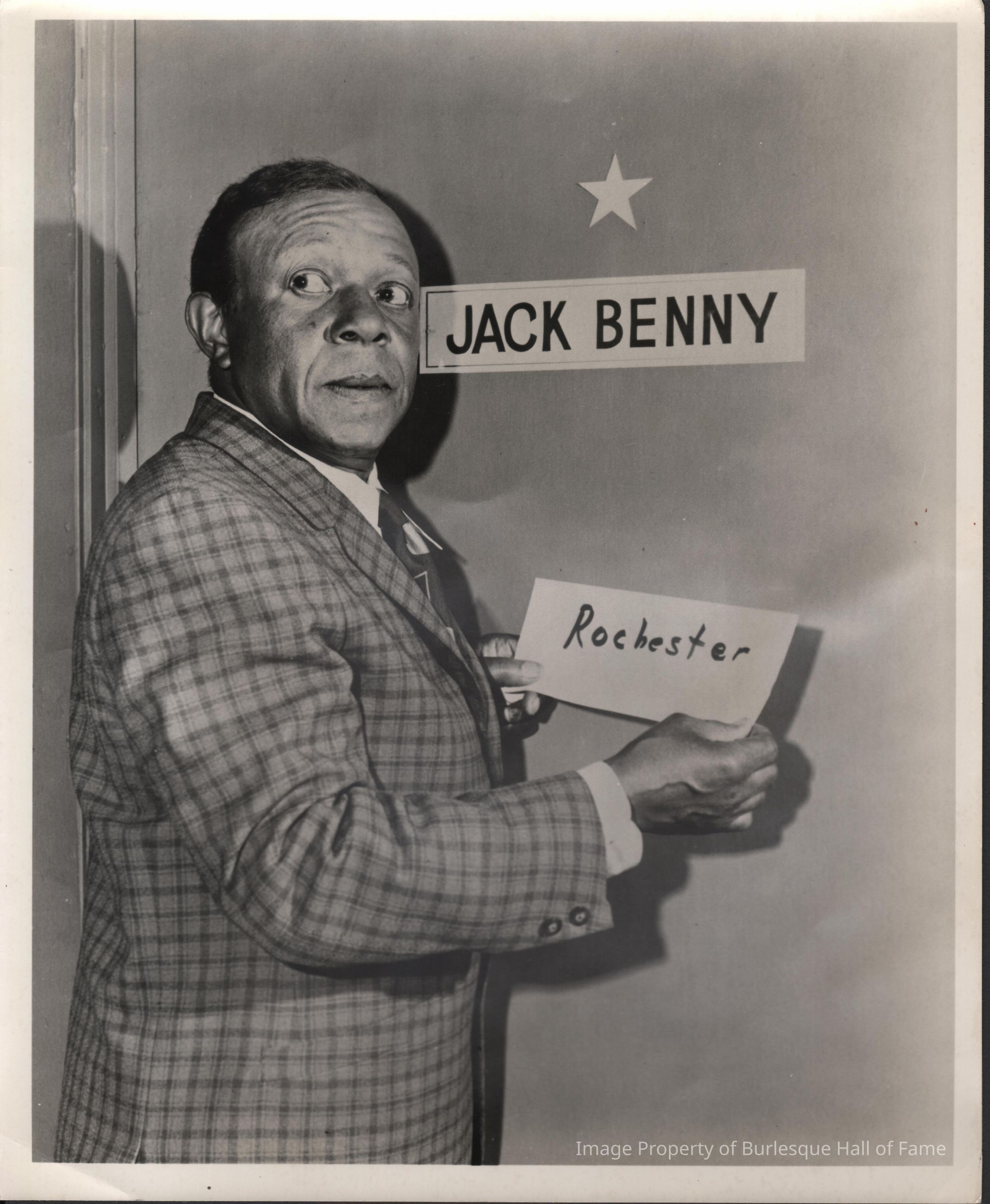 Photo - Jack Benny, B & W. in front of dressing room, holding a sign that says Rochester .