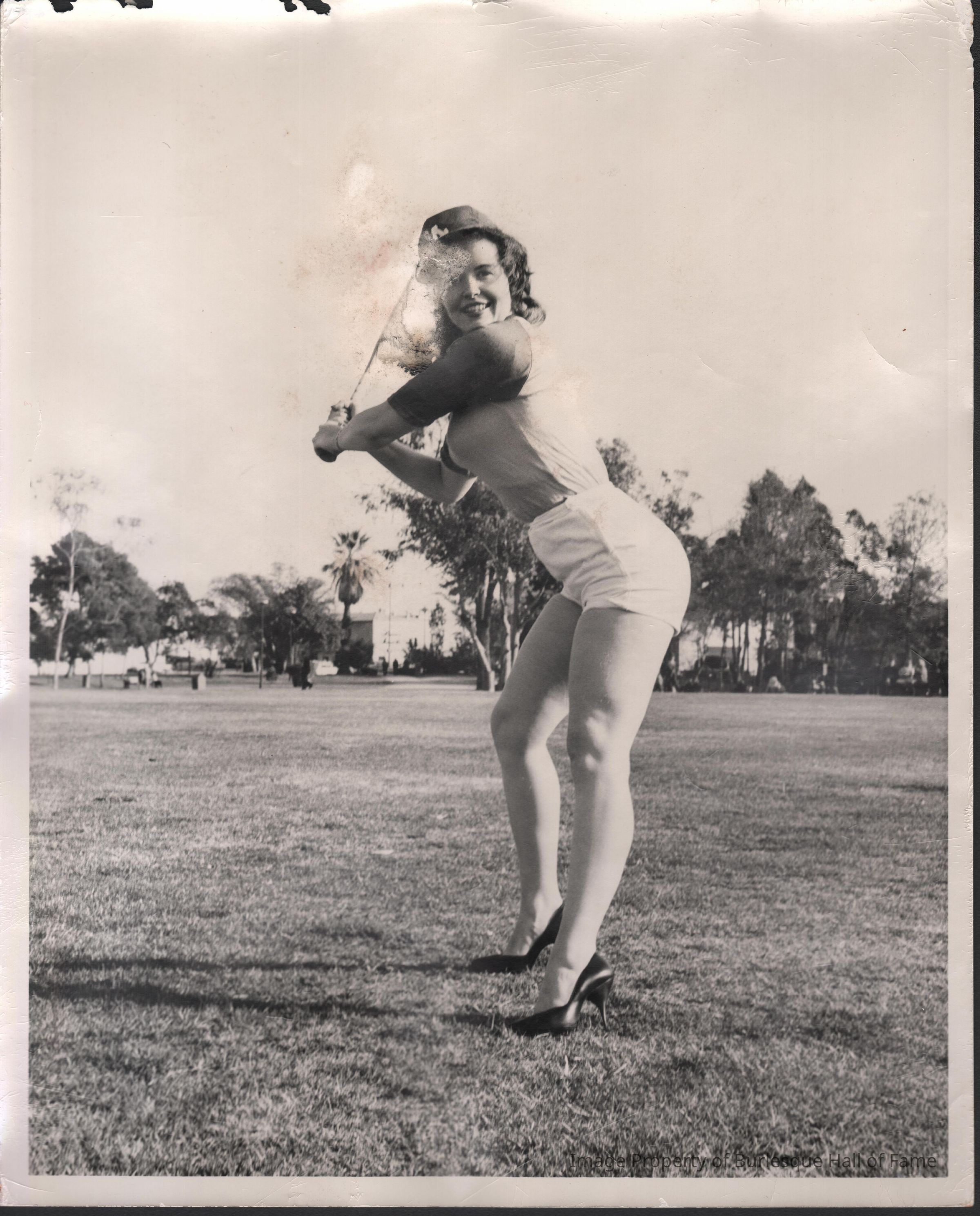 Photo - Linda Doll, B&W, posed outdoors w/ bat
