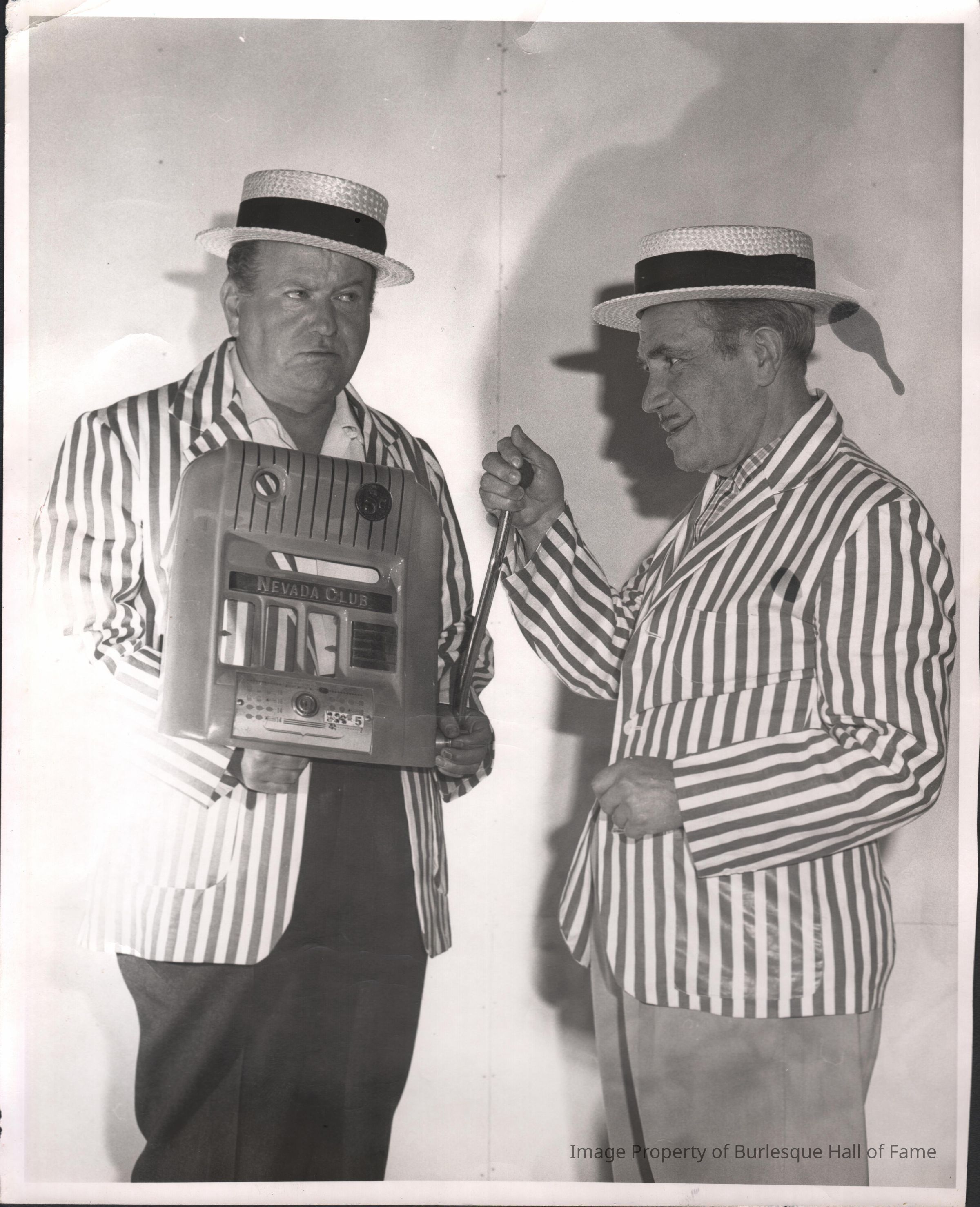 Nevada Club, Las Vegas. B&W, wearing boaters and stripped coats with slot machine.