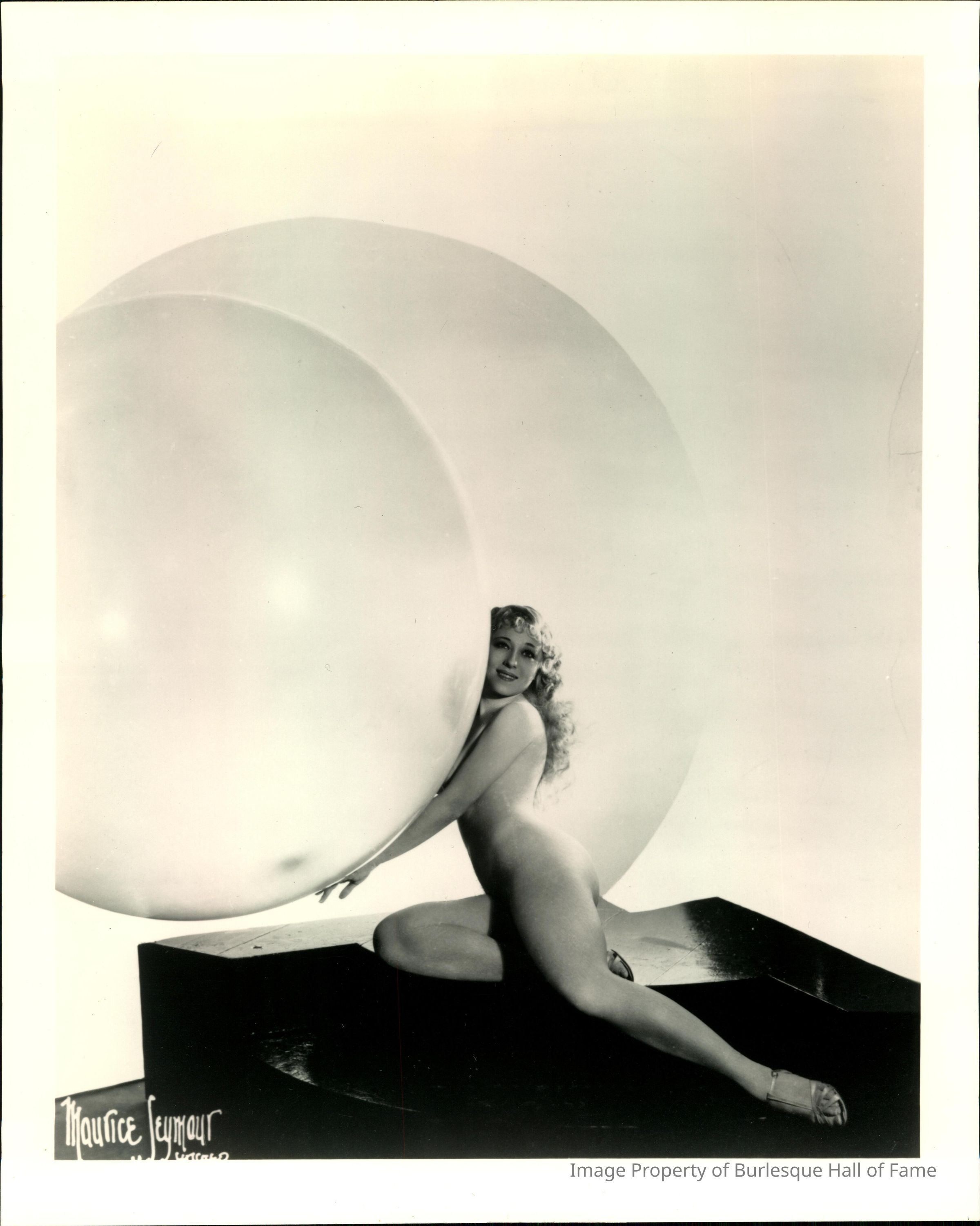 Photo - Sally Rand-Nude-sitting on shiny raised surface-two large bubbles-B&W
