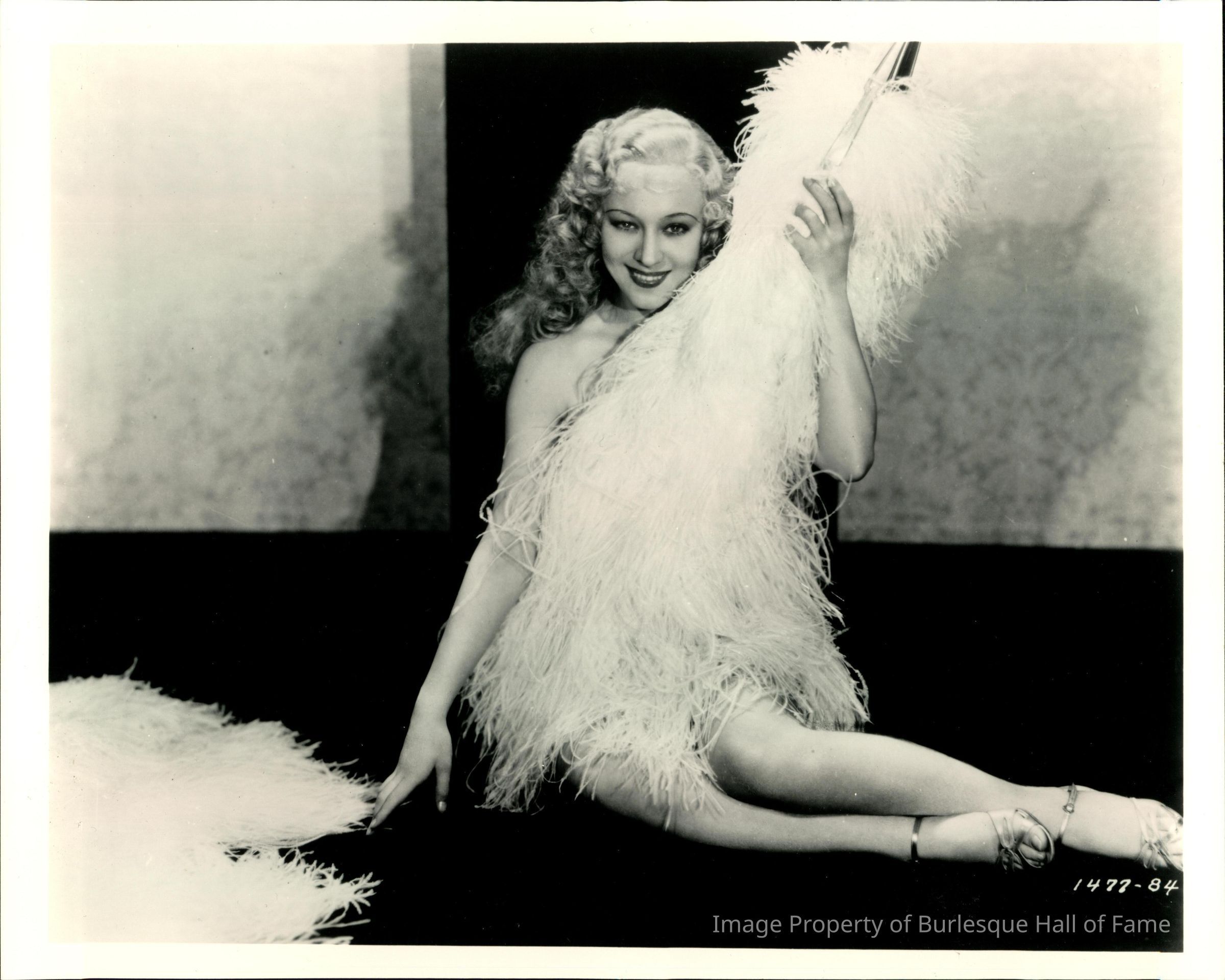 Photo - Sally Rand- sitting on ground with large fan-B&W