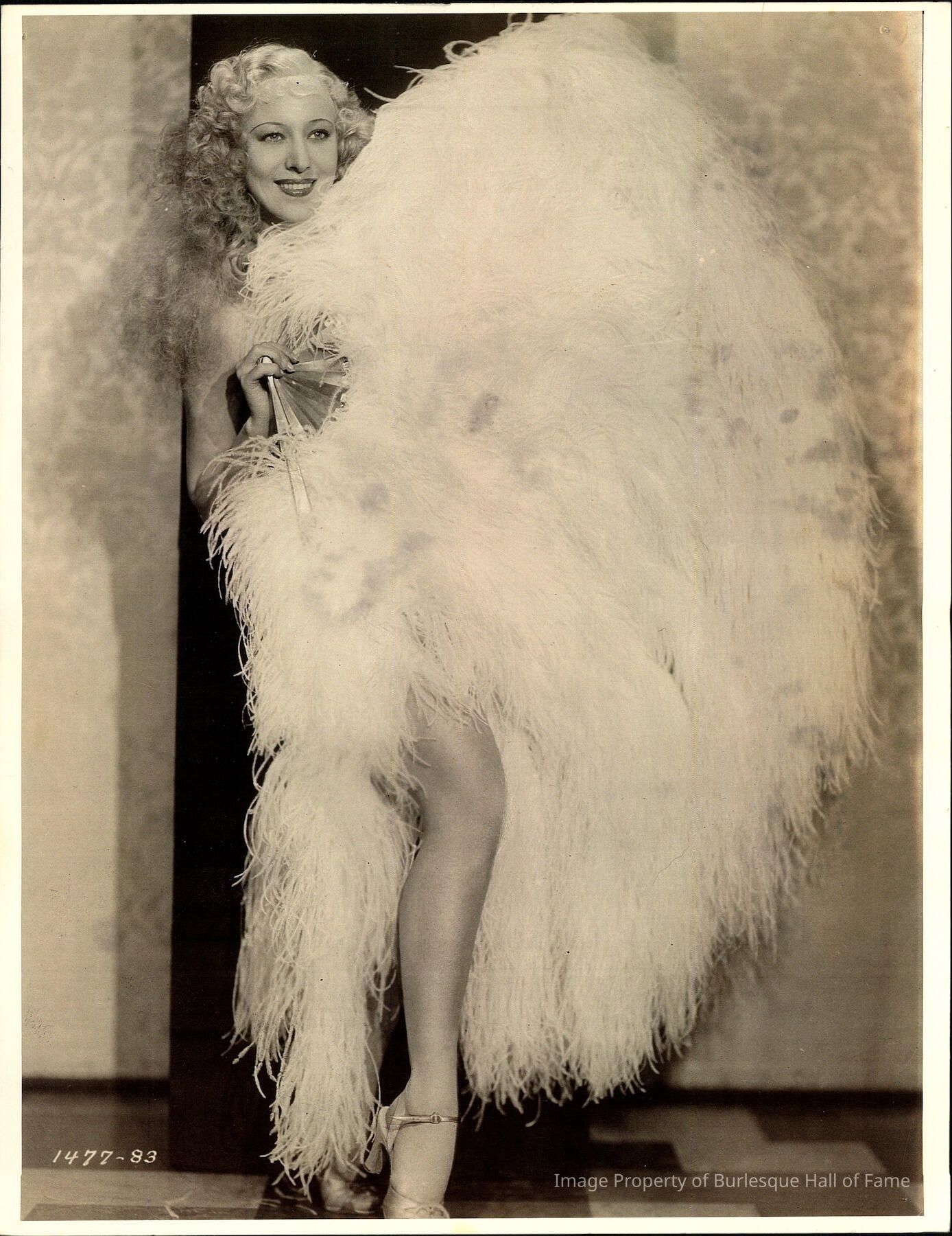 Photo - Sally Rand-Standing by wall covered with feather fan-leg showing-B&W