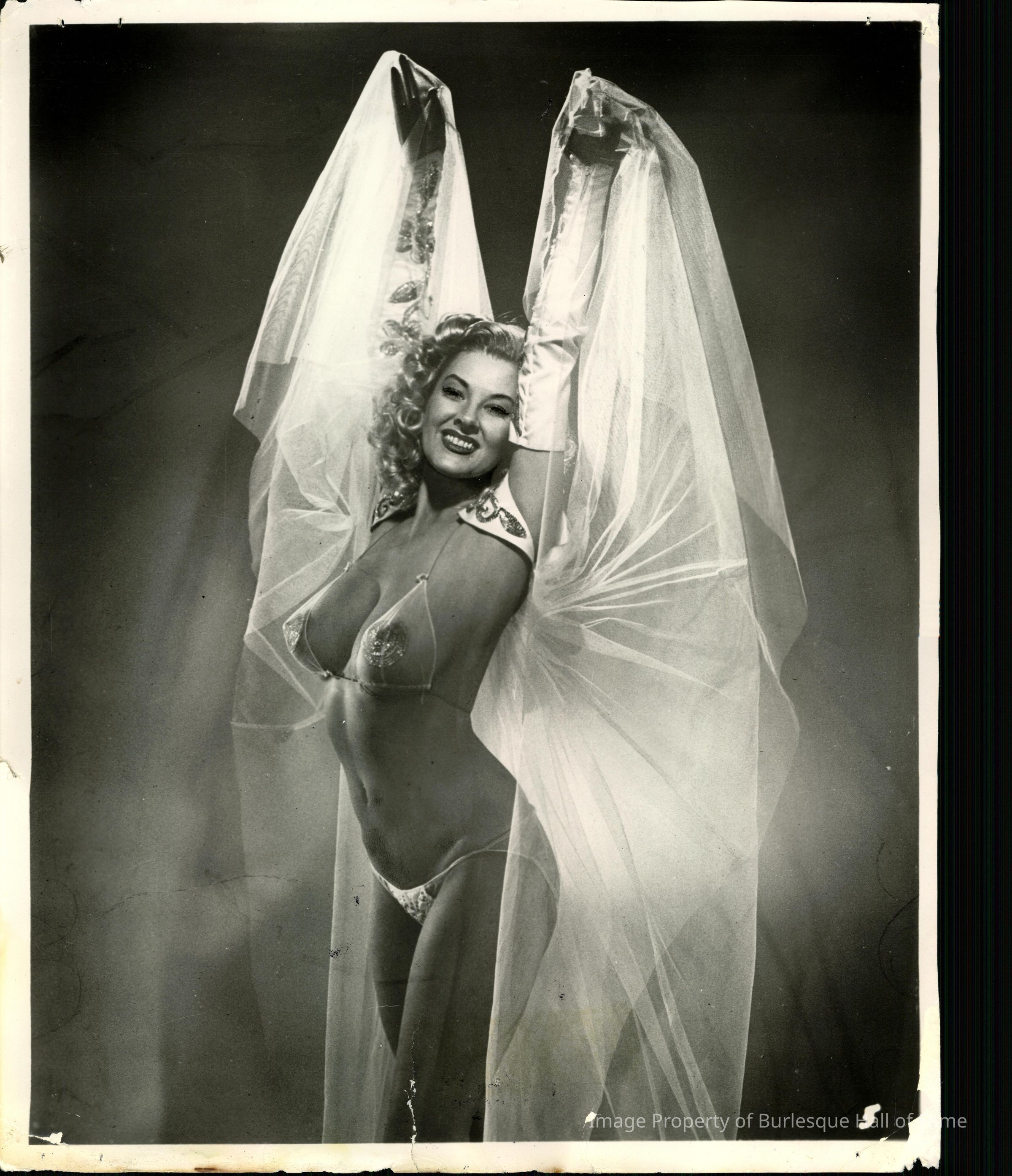 Photo - Taffy O'Neil-B&W-Sheer Bra and Panties-Pasties under Bra-Sleeves-Holding up sheet fabric.
