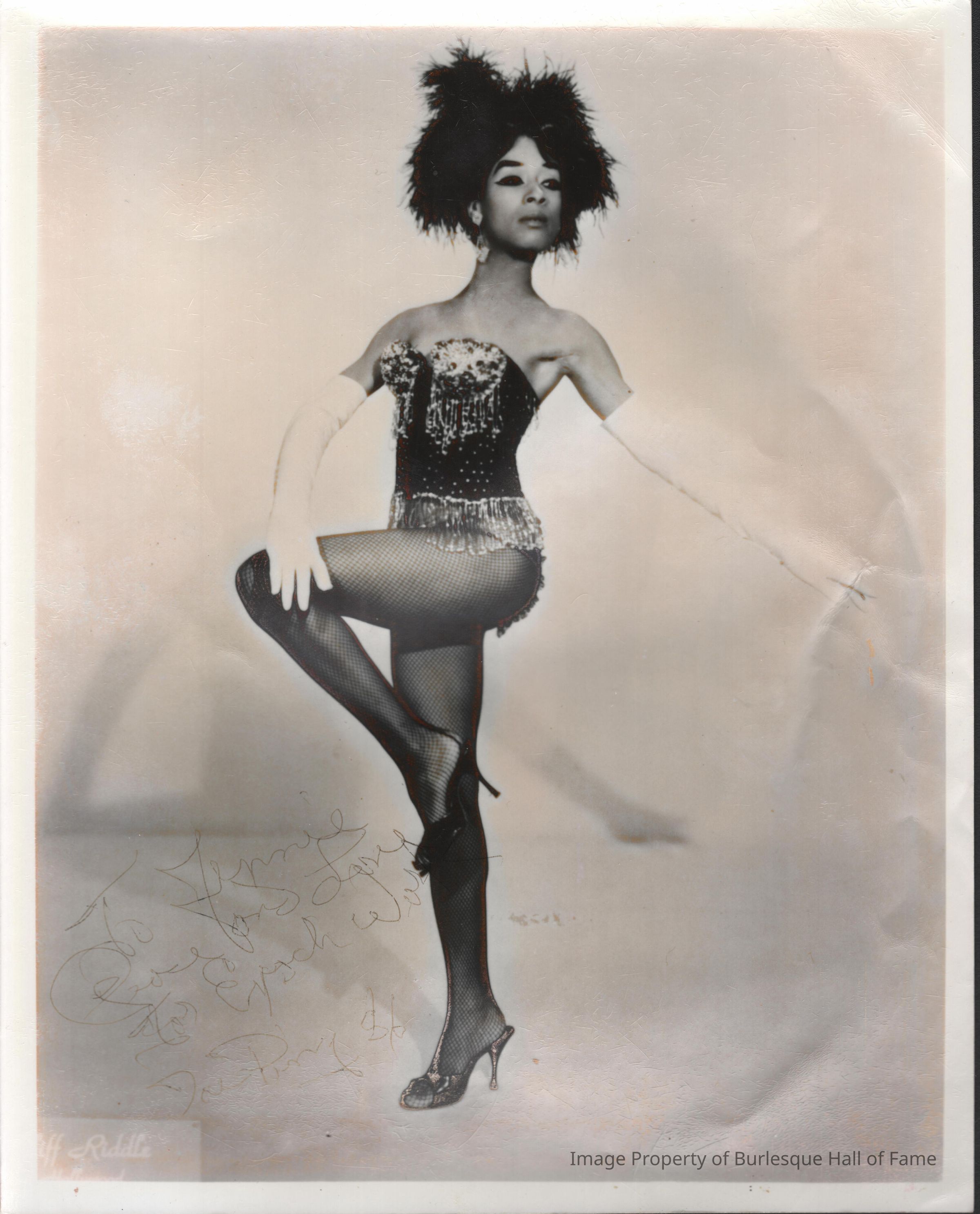 B&W, bustle, fishnets, headpiece. Signed "To Jennie"