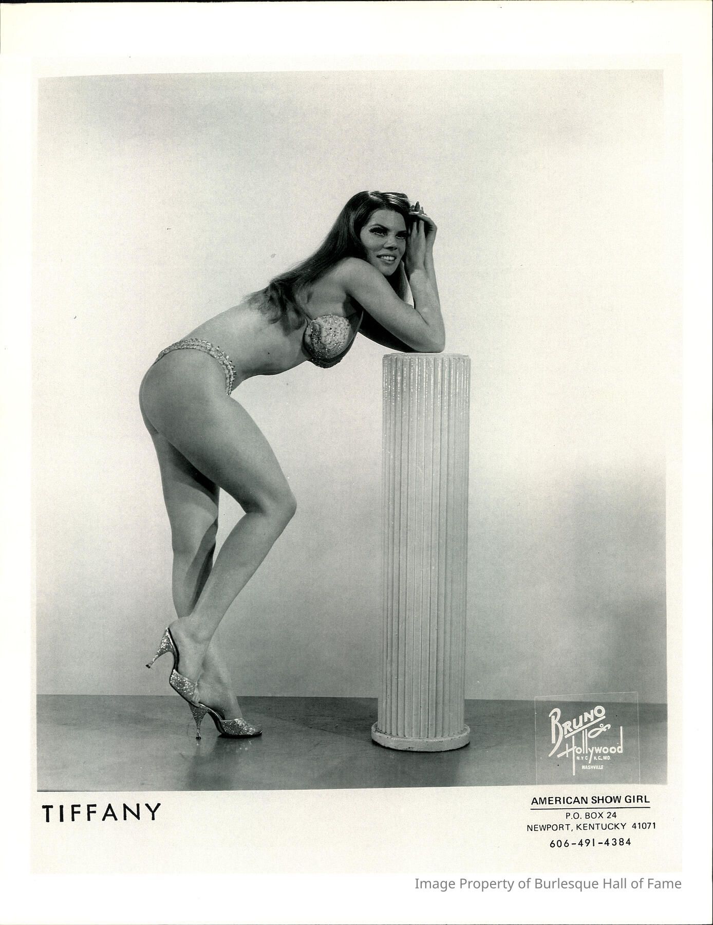 Photo - Tiffany Carter-B&W-Bra, g-string and sparkly high heels-leaning on pillar