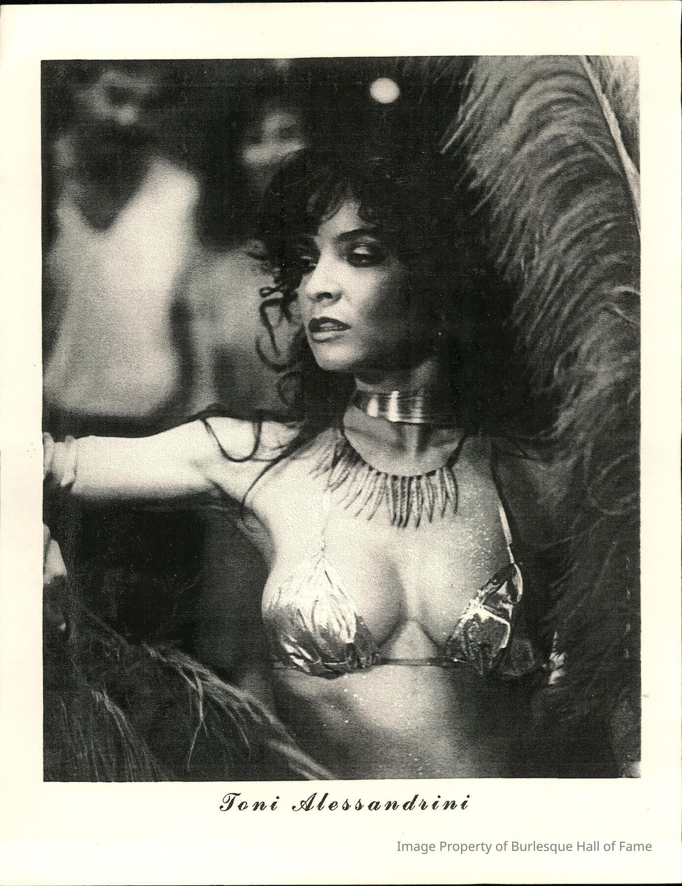 Photo - Toni Alessandrini-B&W-Bust Shot-Shiny Bra-Giant Feathers