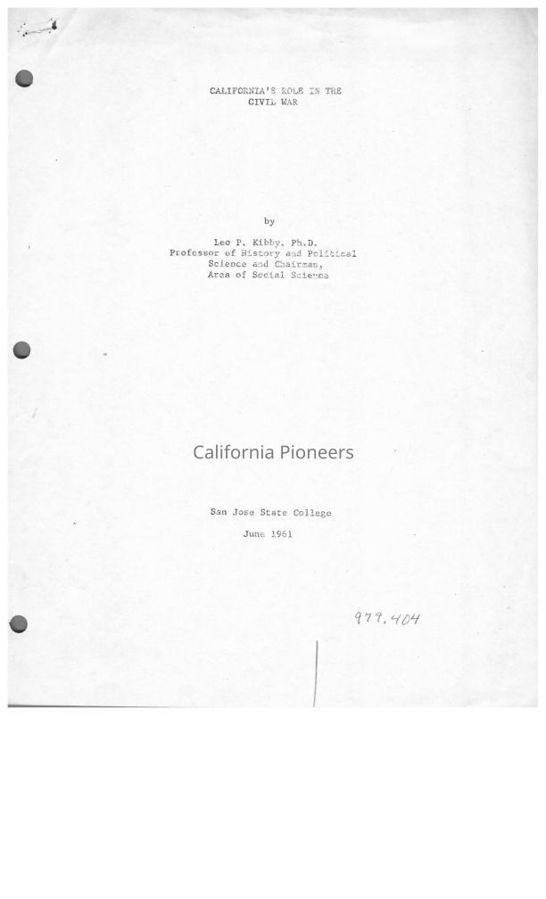 1961 entry to the California Pioneers Essay Contest by Leo P. Kibby, Ph.D.