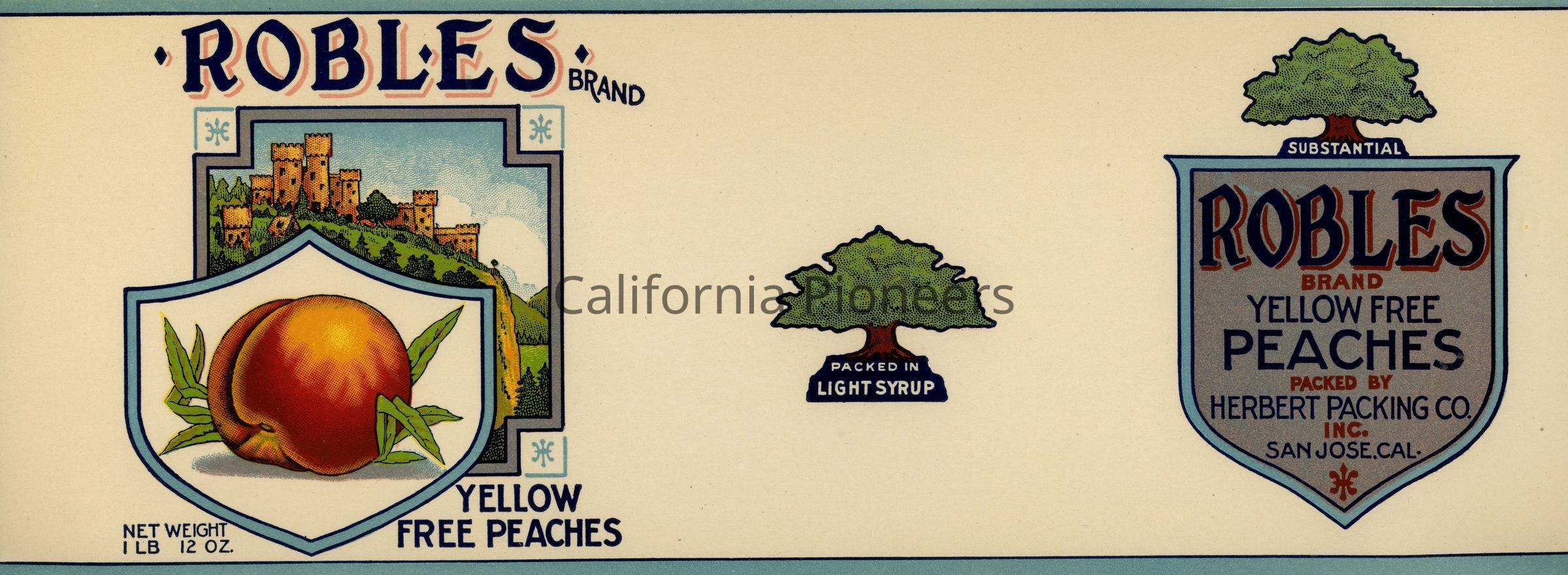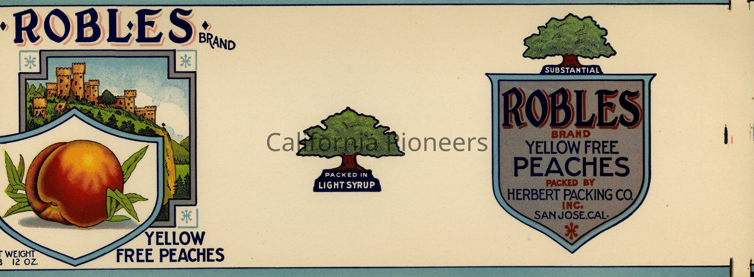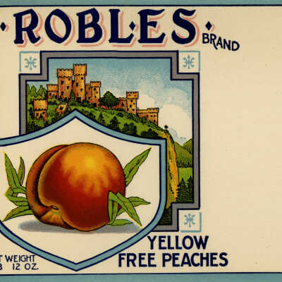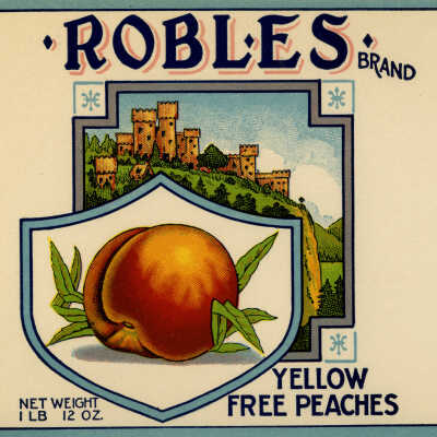 Can label for Robles Brand Yellow Free Peaches from Herbert Packing in San Jose