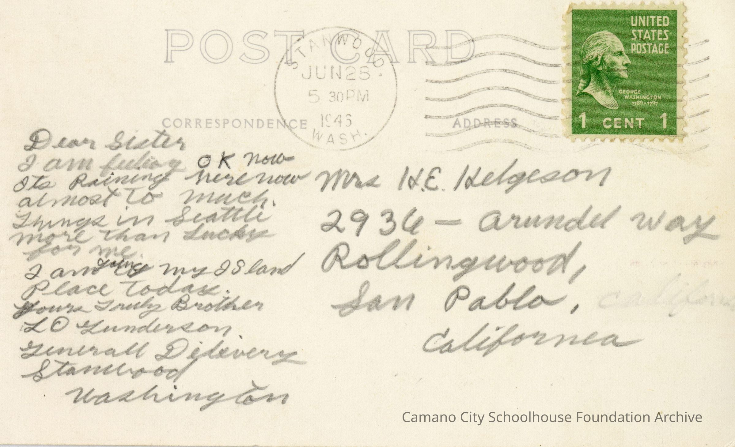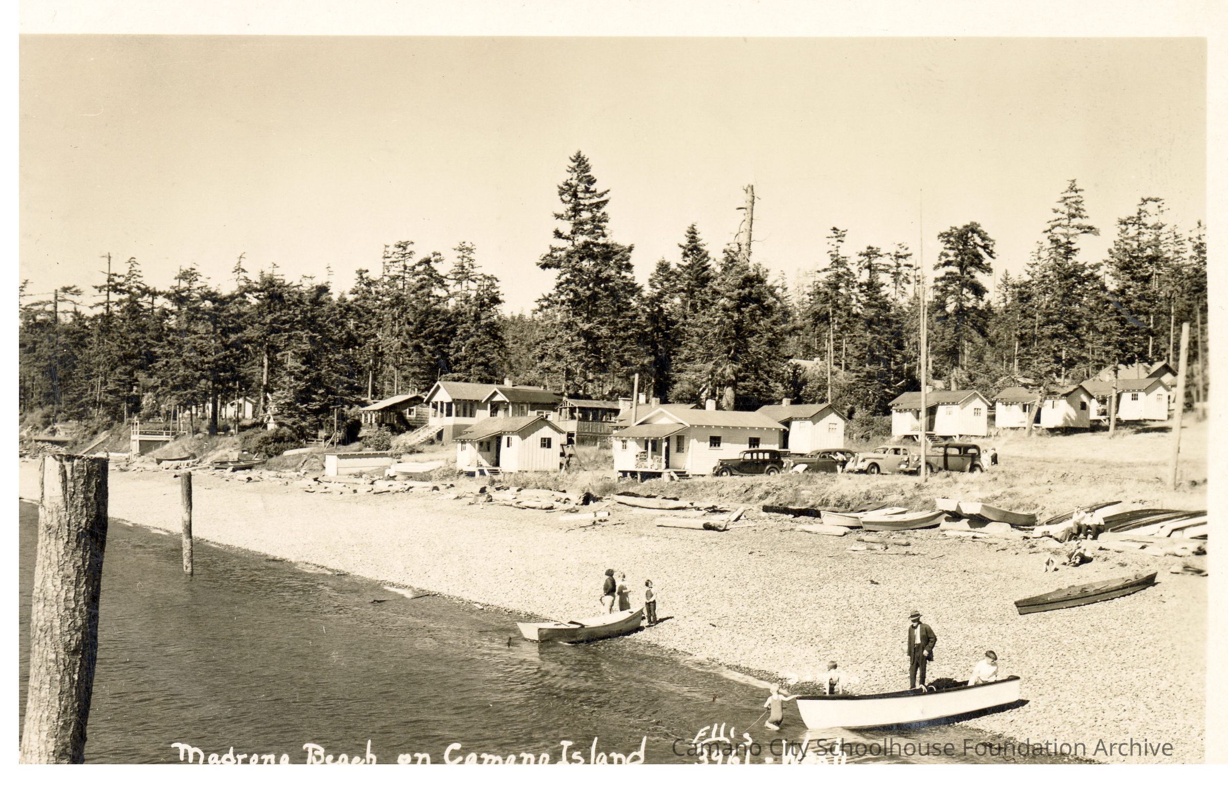 A postcard featuring a photograph by John Boyd Ellis of Madrona Beach. Postcard sent 1943 from a Seattle resident to his sister in California.Subject Place