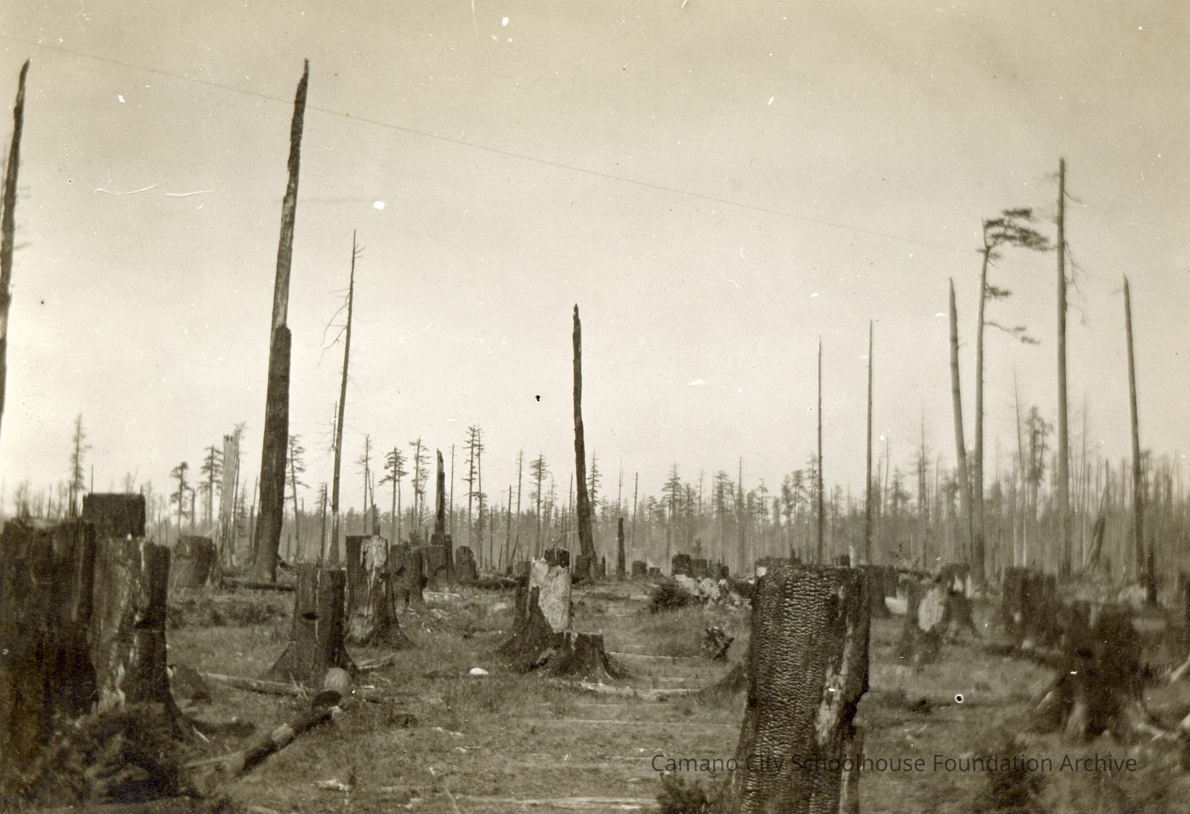 Six men stand in frame, most in suits with their hands behind their backs. They are spread around the right side of the photograph, and the left is dominated by an old-fashioned cargo truck with a large (approximately 20 ft long by 5 ft across) log on the truck bed. 2023.001.I.B2.a012