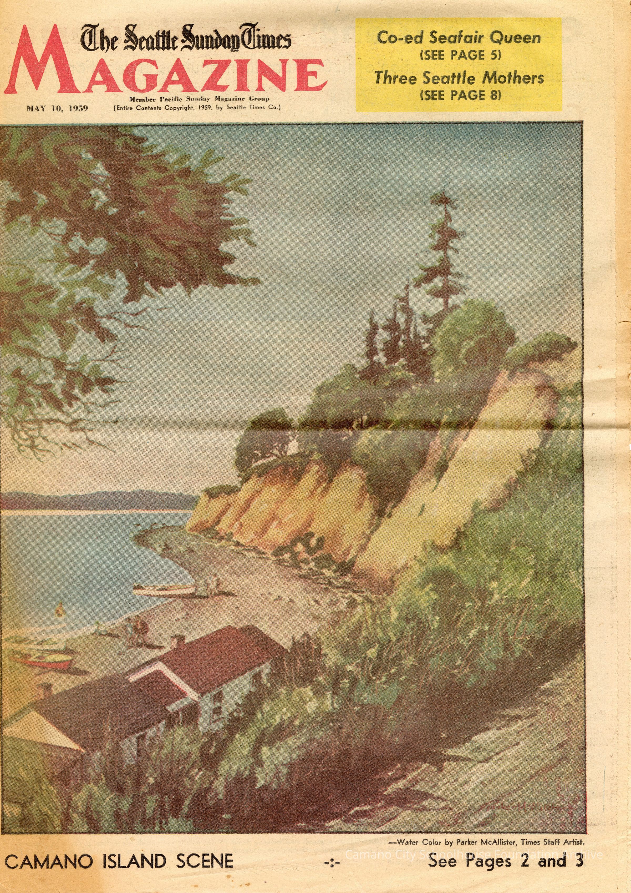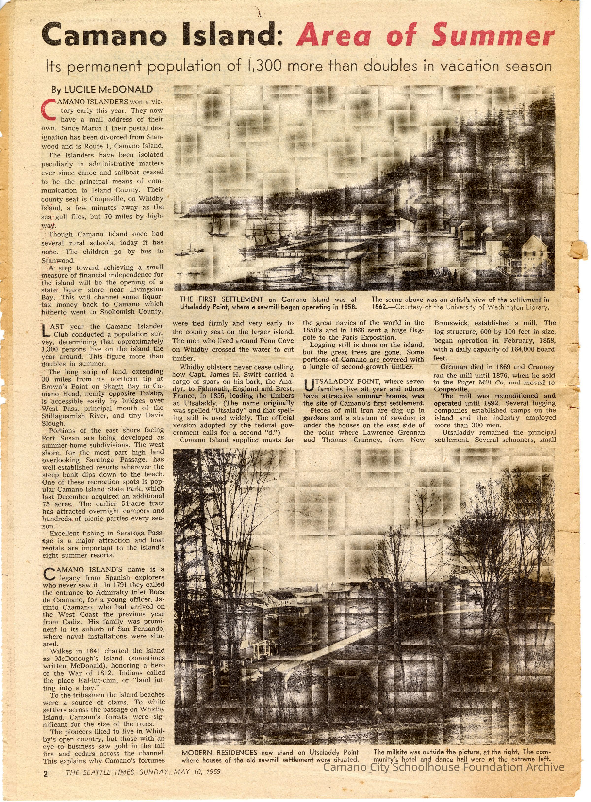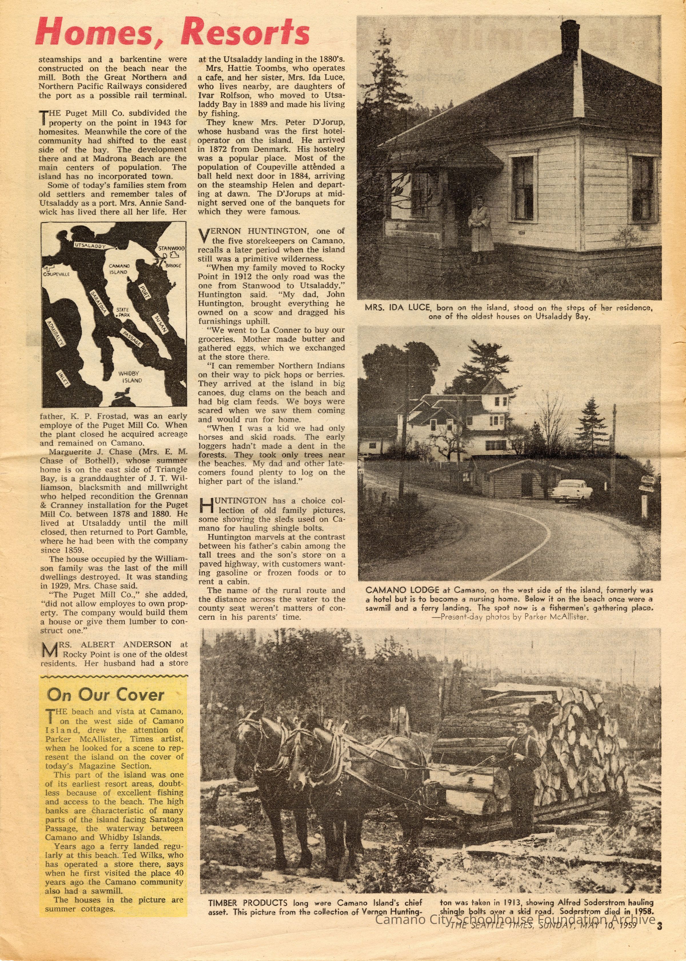 A profile of Camano Island Resorts from the May 10, 1959 issue of the Seattle Times Sunday Magazine. The profile is the cover of the "magazine" as well as the first two pages, and covers some history of the island as well as present day (1959) resorts and summer activities.Collection
