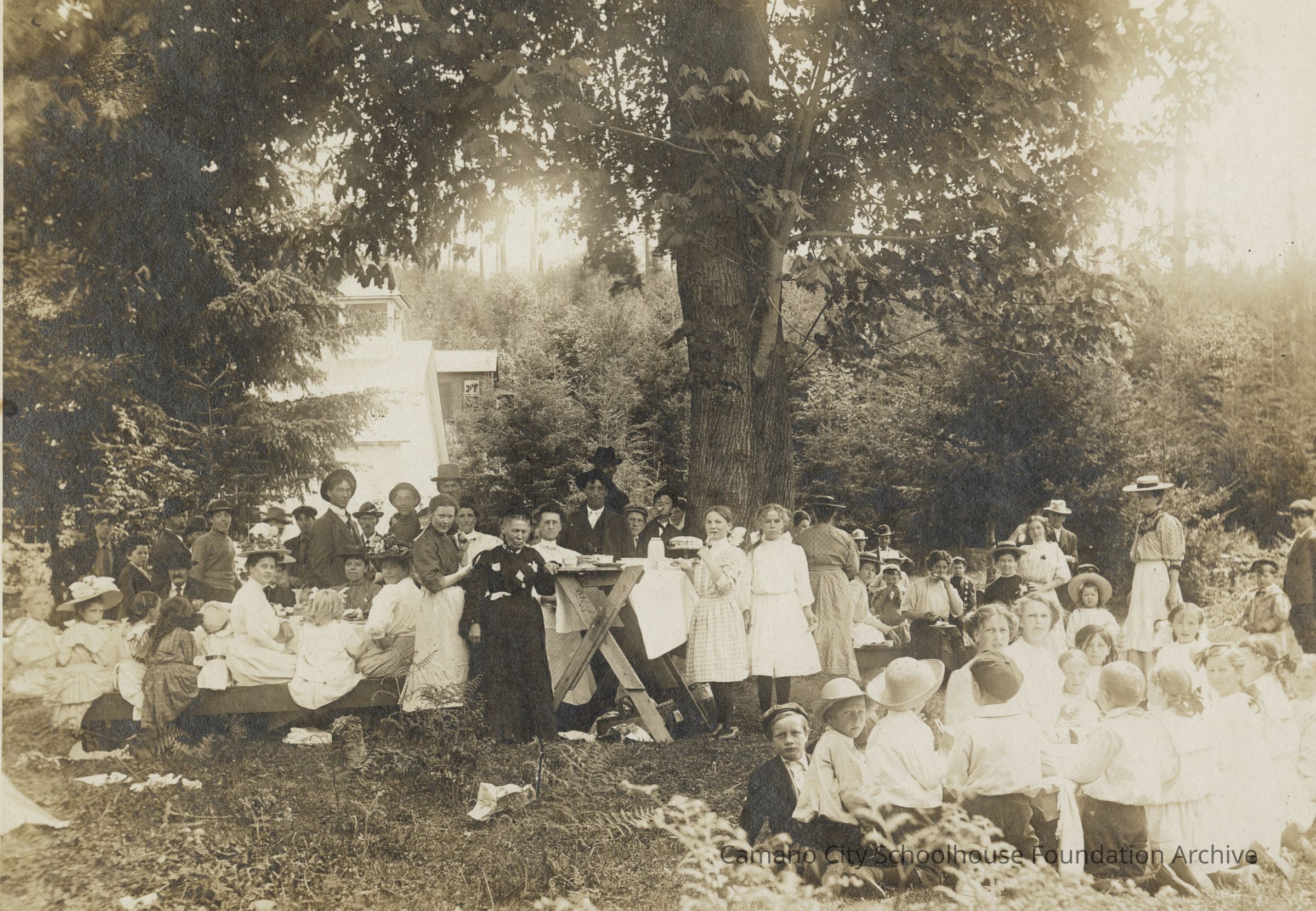 A black-and-white photograph of many people gathered around tables under a large tree. Handwriting on the back says "Utsalady School Picnic, June 1909, (Carrie Bennet Bill)"Collection