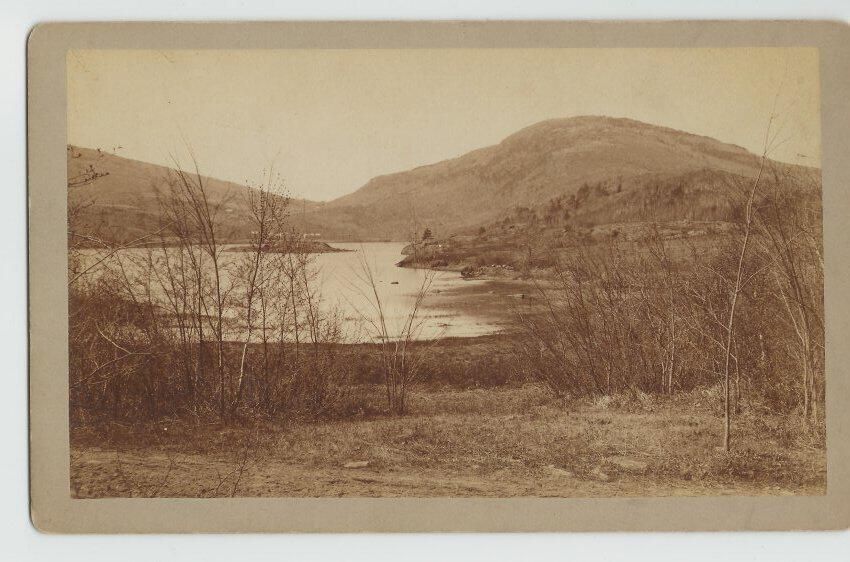 photo of Hosmer Lake and Bald Mountain, part of collection by Lane called Camden Scenery, photograph shows Hosmer Lake now known as Hosmer Pond with Bald Mounatain to the right. The view is north, northwest. The Hosmer Homestead is visible at the far end of the lake.Collection