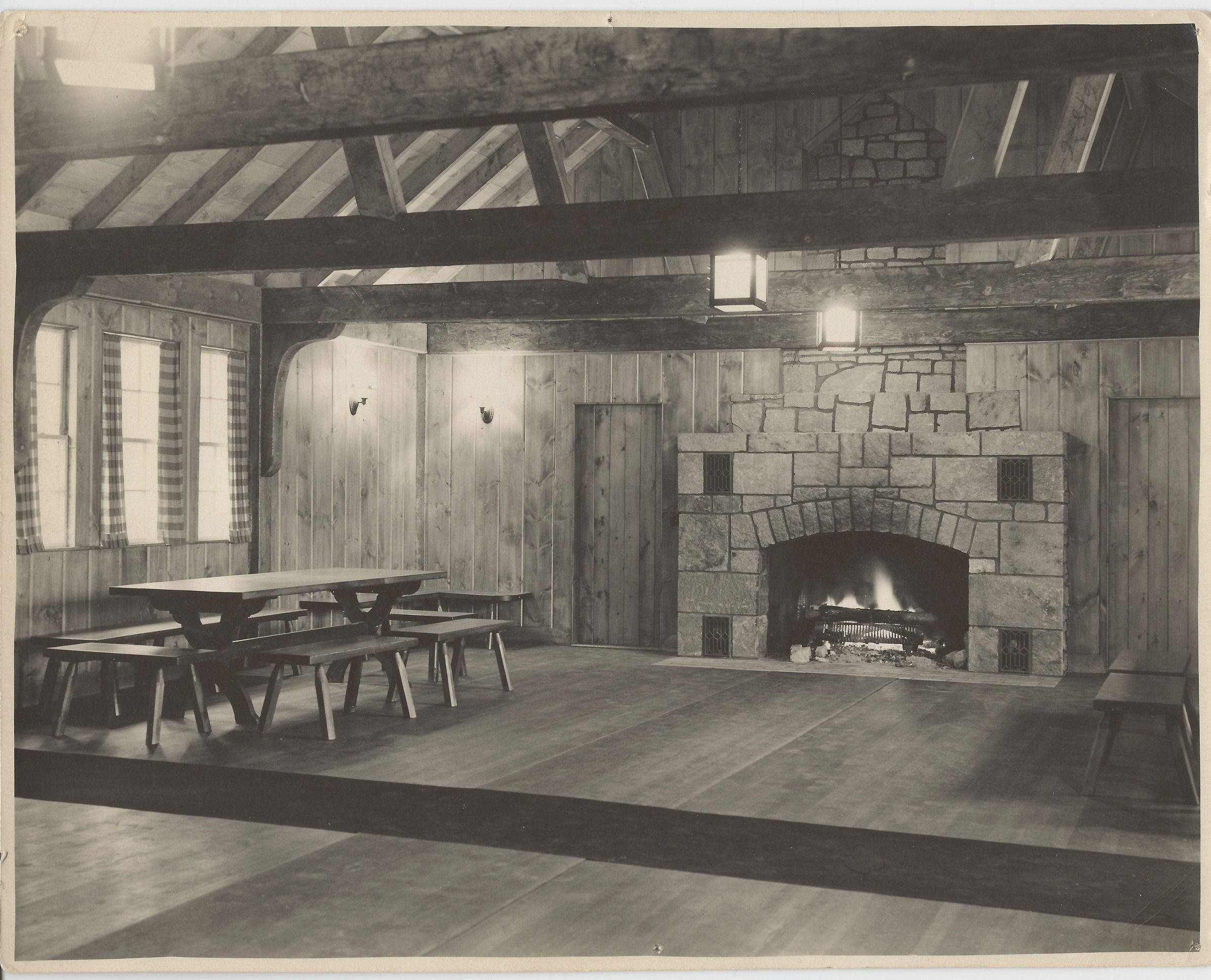 black and white photo of the interior of the newly completed Snow Bowl Lodge. It shows the new fireplace, beamed ceiling and a table and benches. Built by volunteers and completed in 1937.Collection