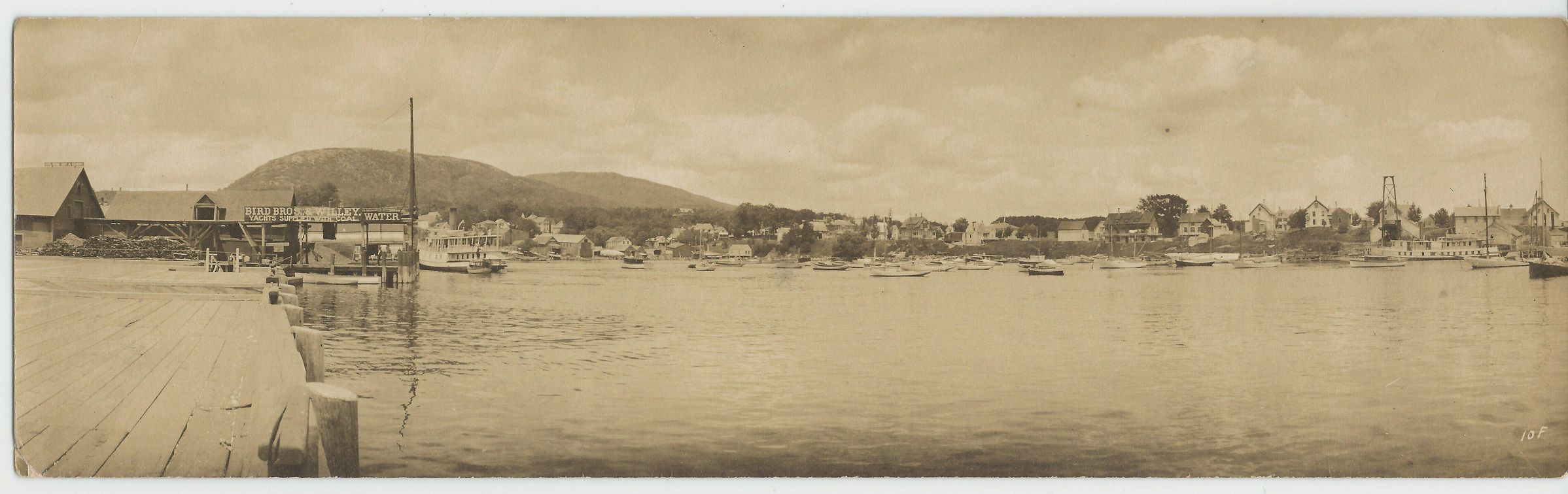 black and white panoramic postcard of Camden's inner harbor. In the extreme left of picture on western side of harbor is sign "Bird Bros. & WIlley" (selling coal, wood, flour). Mt. Battie is in background. On eastern side is Camden Yacht Building and Railway with small steamboat at dockCollection