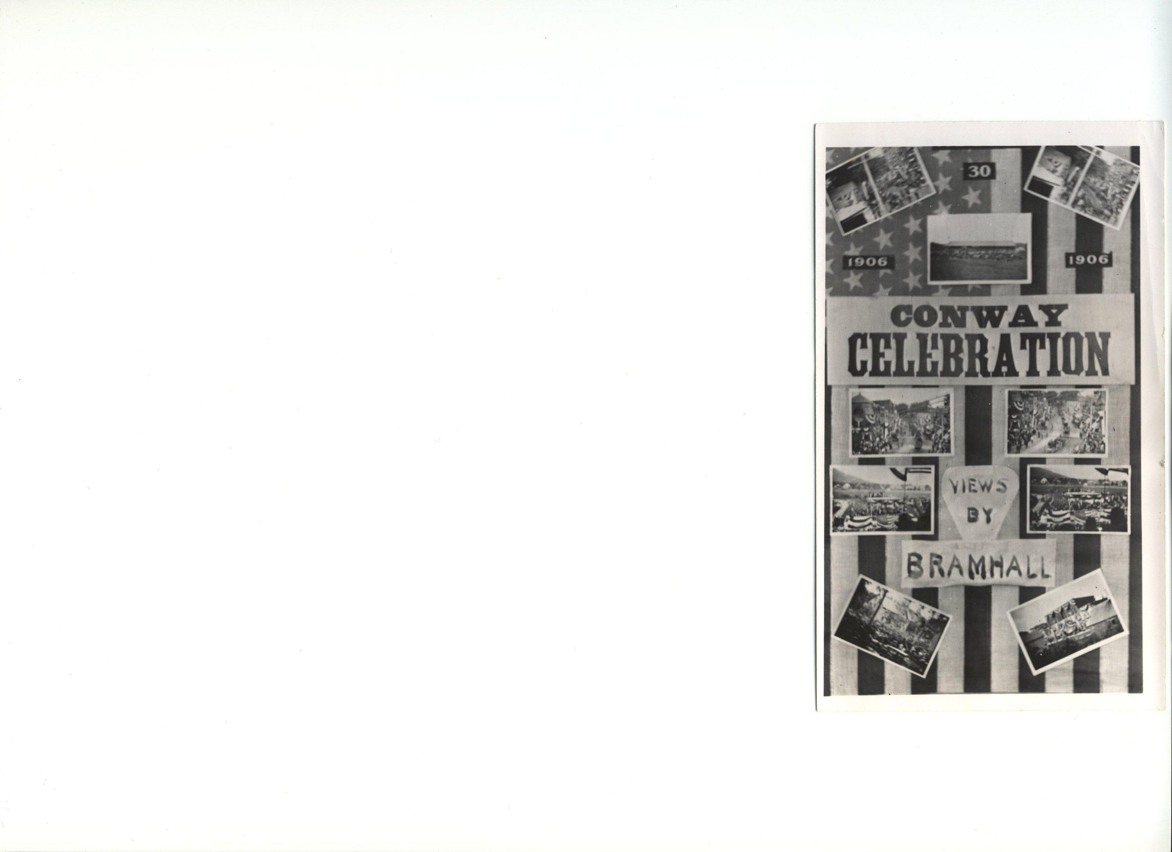 a black and white photo of a display of 9 photos of the Conway celebration in 1906. On the poster is the sub-title 'Views by Bramhall"Acquisition