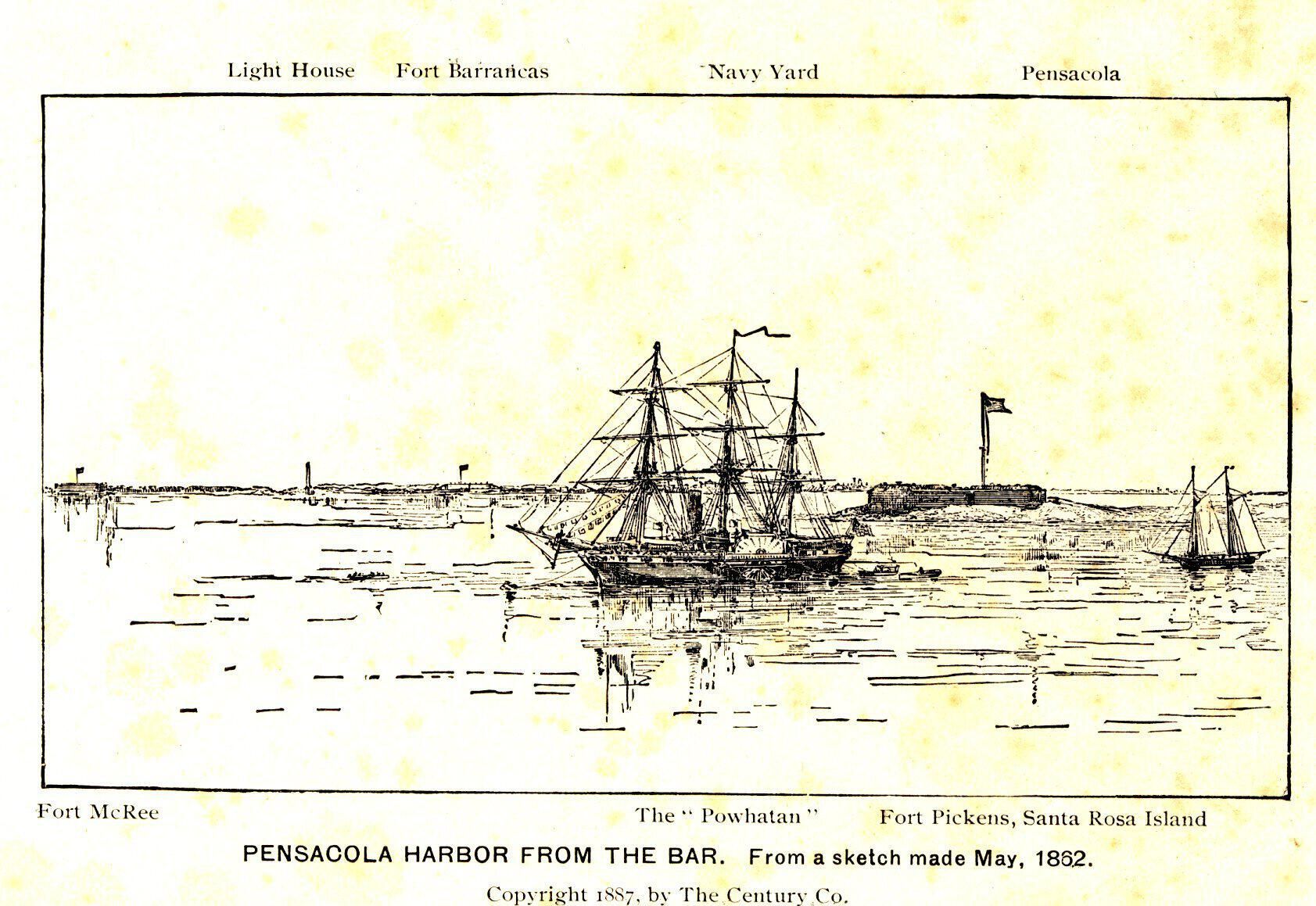 a line drawing of Pensacola Harbor from the Bar, from a sketch made in May, 1862, show Fort McRee, the ship "Powhatan", Fort Pickens and Santa Rosa IslandCollection