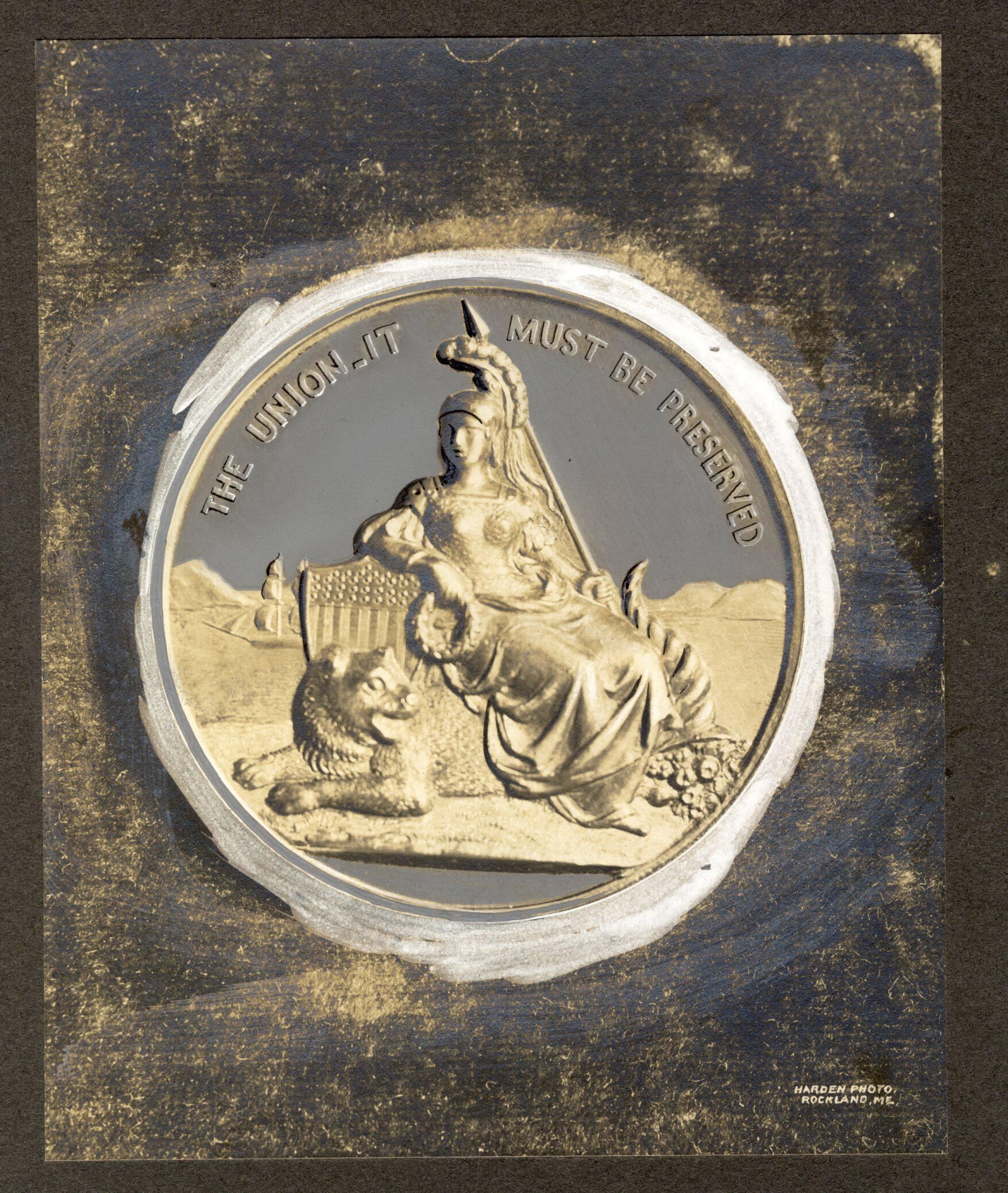 a photo of a medal presented to William Conway. The medal shows Lady Liberty and it is inscribed with the words "The Union-It must be preserved". A clipper ship is in the background.Acquisition