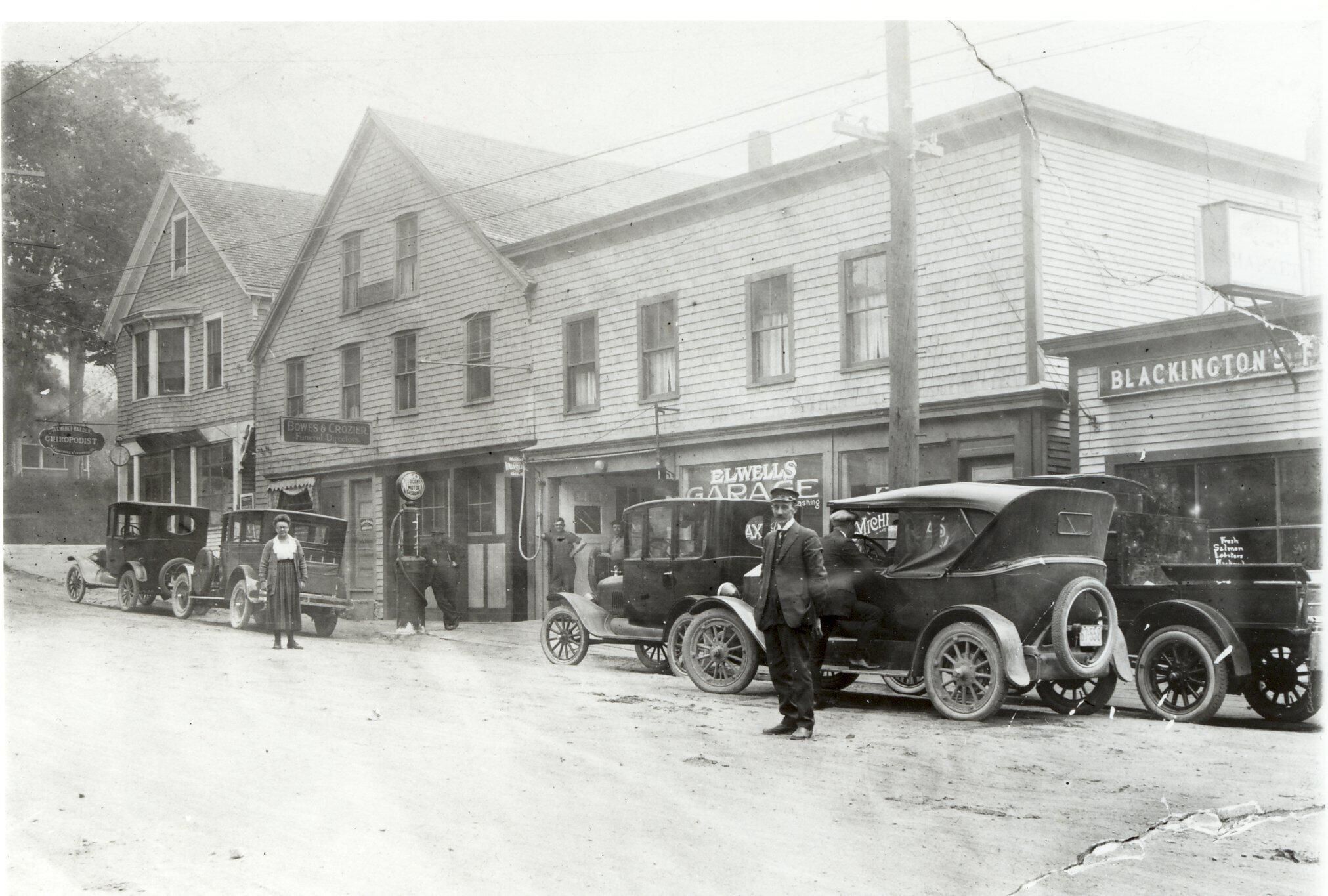 Image of Main Street in Camden circa 1920. Businesses include Elwell’s Garage, Blackington's Fish Market, Bowes and Crozier Funeral Directors, and Clement Walden, chiropodist. The woman standing to the left in front of the cars is Tillie (Lulu) Elwell who also ran a taxi service.Collection