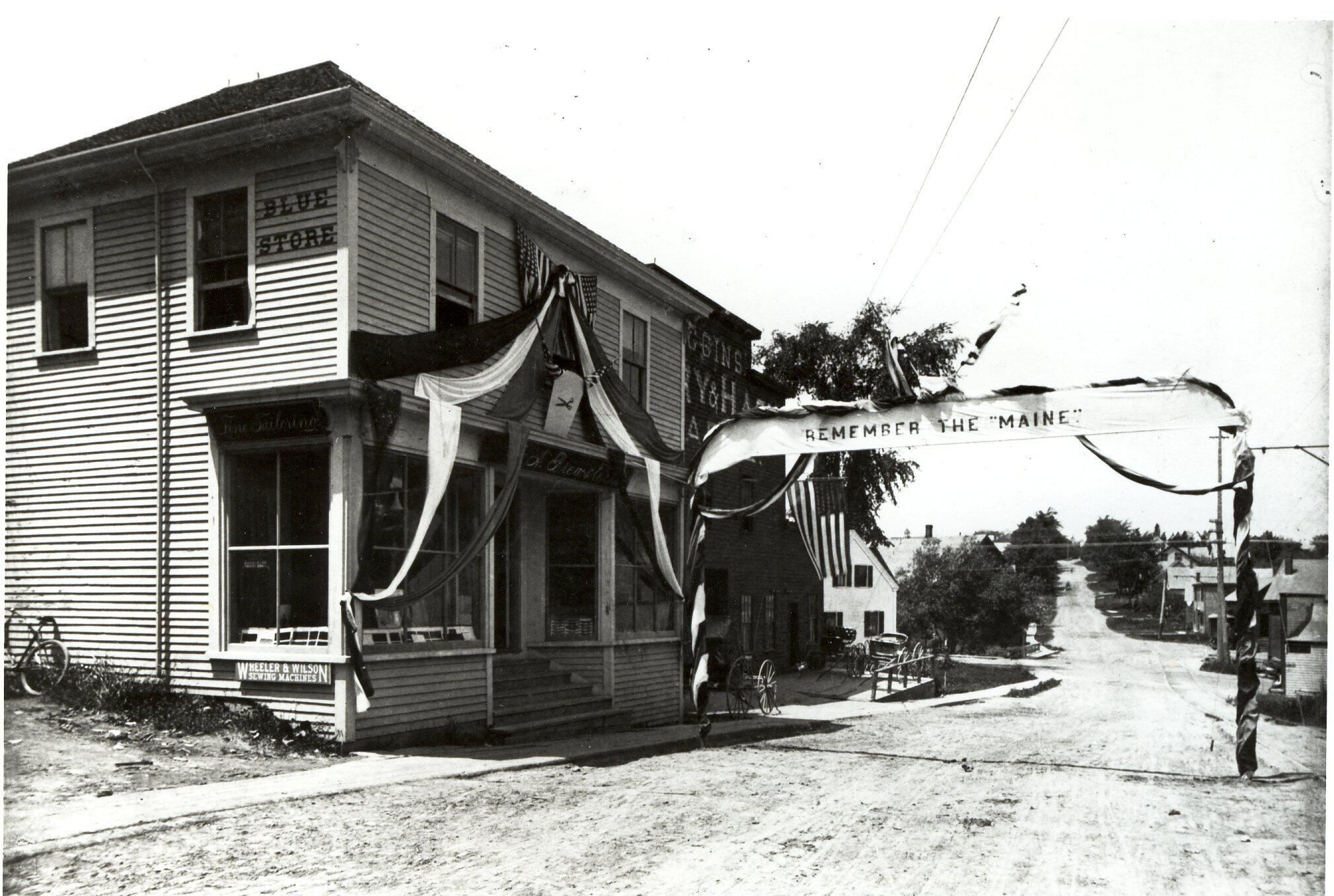 The start of the Spanish American War centered around the sinking of the battleship Maine. This banner on Washington St. near the police station shows that town sentiment backed the US soldiers in their quest with the famous slogan "Remember the Maine"Collection