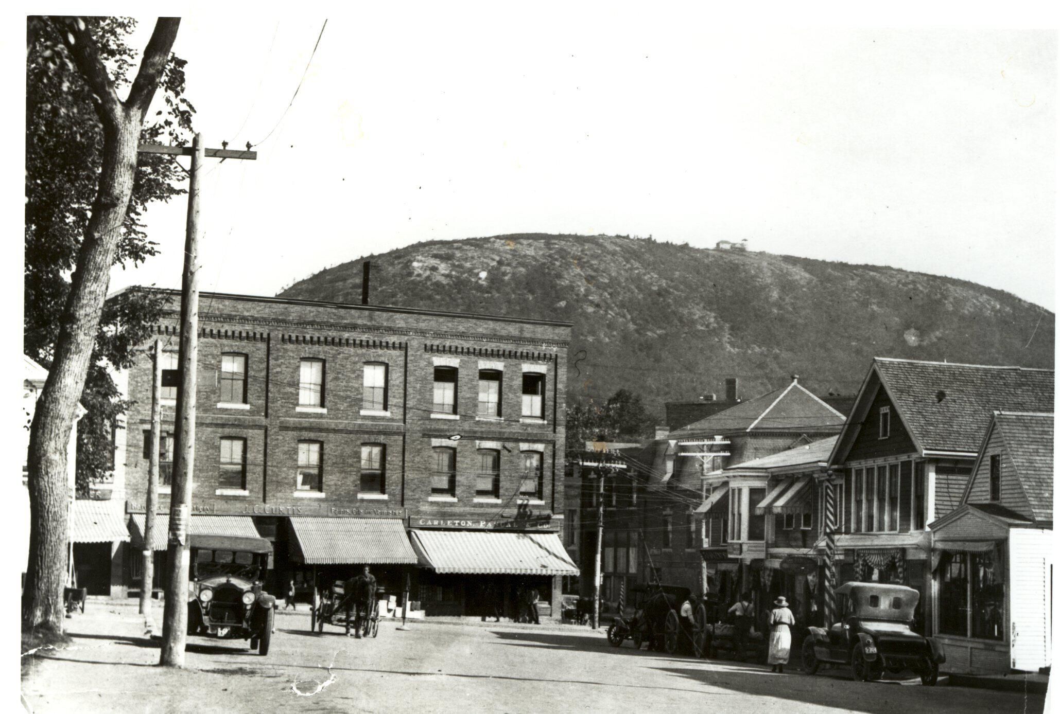 photo shows the intersection of Chestnut St. and Main St. In the center of the photo is Carleton & Pascal store and J.C. Curtis store. The Mt. Battie House at the top of Mt. Battie is visible. Period automobiles are parked on the streetCollection