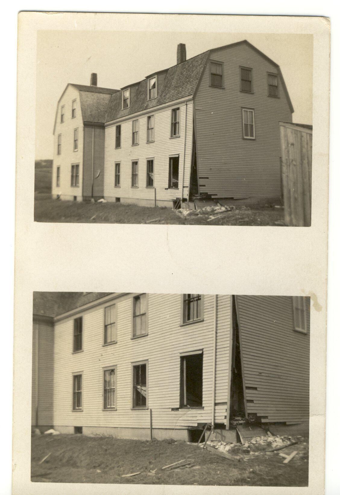 postcard of 2 black and white pictures of the boarding house that was bombed during the labor trouble and strike at the Woolen Mill (written in ink on the reverse) located in Millville.Collection