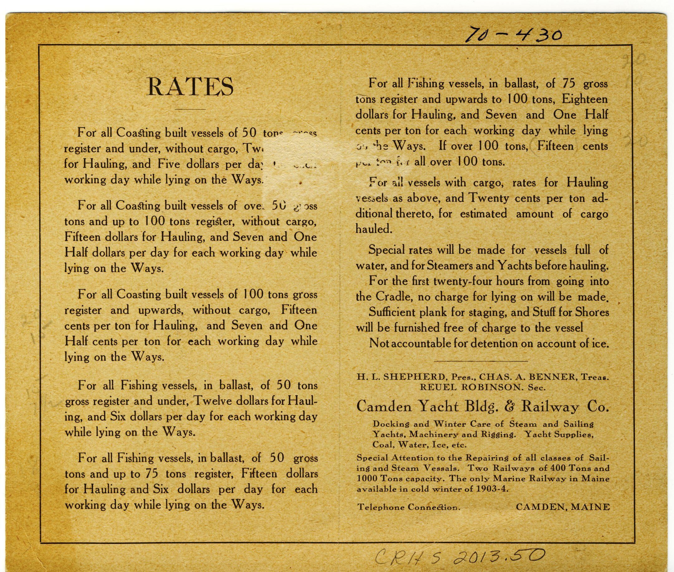 black and white promotional flyer for Camden Yacht Building and Railway Co. Photo shows east side of Camden Harbor with the yacht Lyndonia and a steamboat tied up at the docks. There is also a steamboat on the ways being repaired. On the reverse are the rates for the various repairs.Collection
