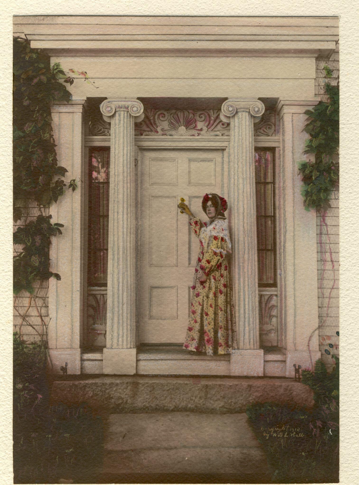 A hand colored photo of a woman knocking on the door of a Camden home. The home 's entrance is flanked by two corinthian columns. An elaborate design can be seen over the door.Collection