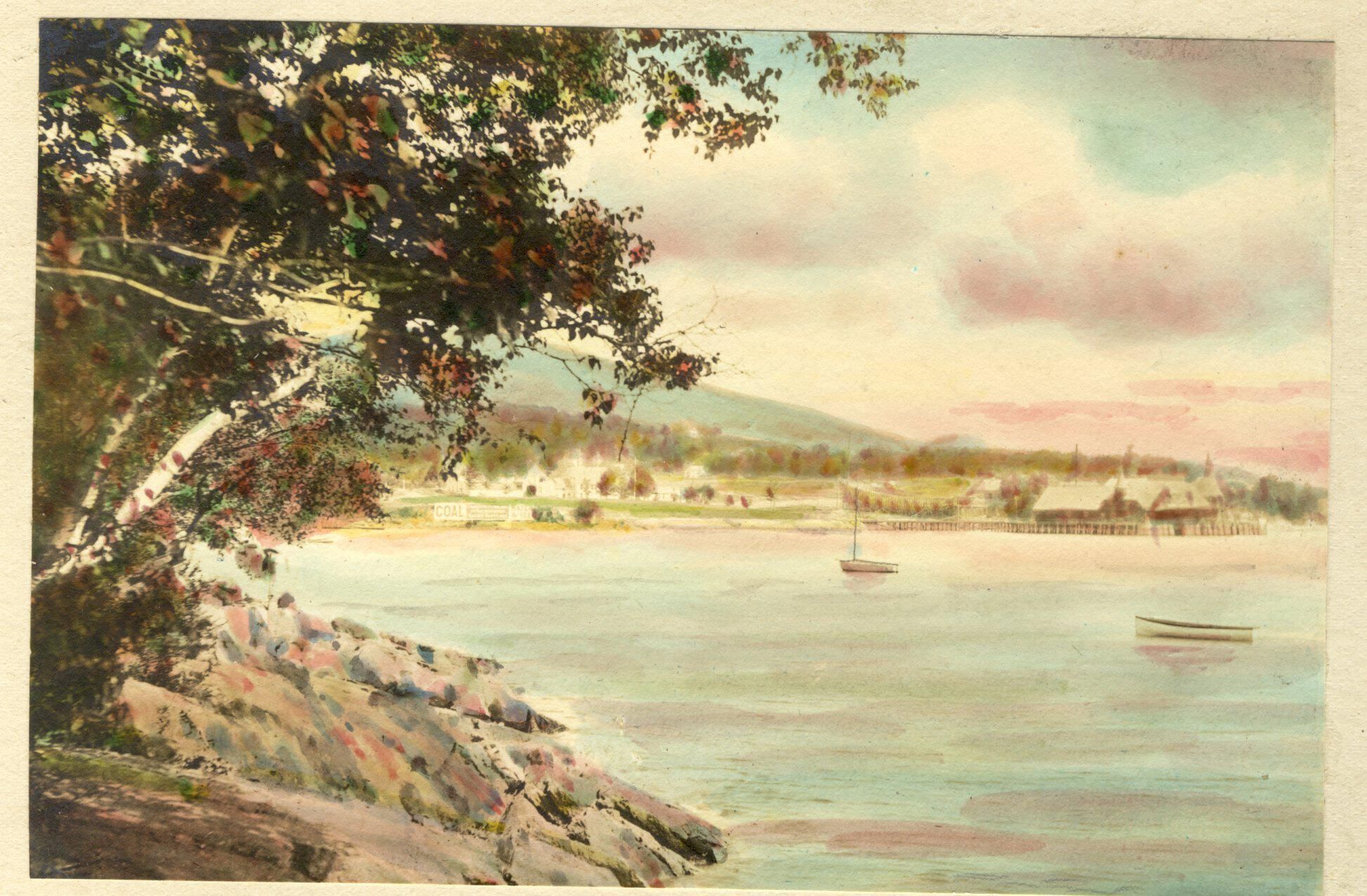 hand colored photograph of Camden's outer harbor. The Steamboat wharf is visible as is the Bean yard. The photo is taken from Bay View St. near Dillingham PointCollection
