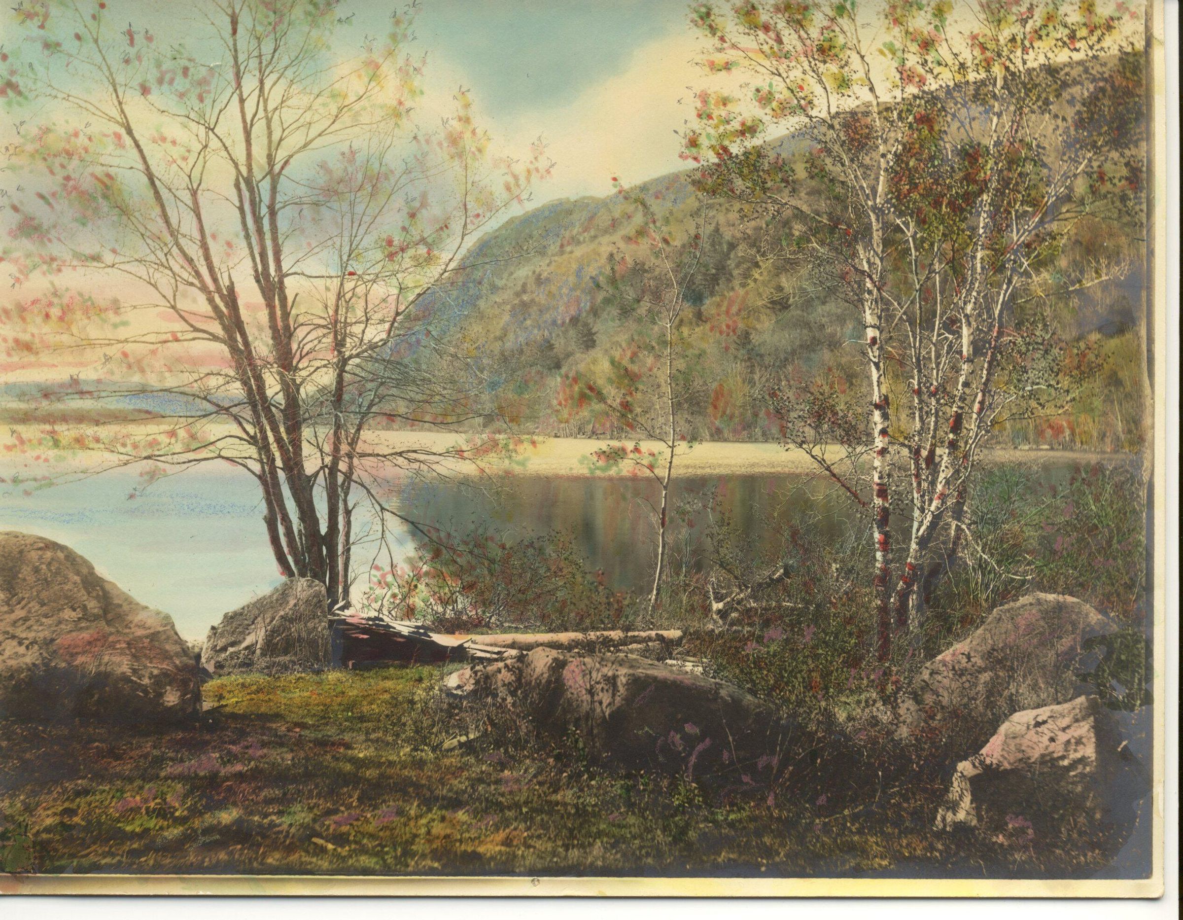 hand colored photo of the southern end of Megunticook Lake with Maiden's Cliff in the backgroundCollection