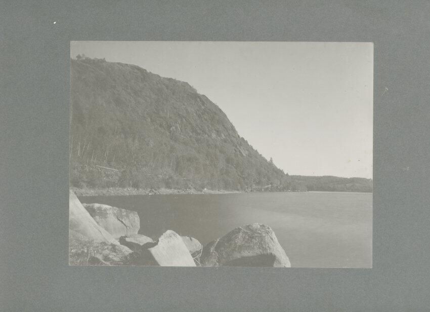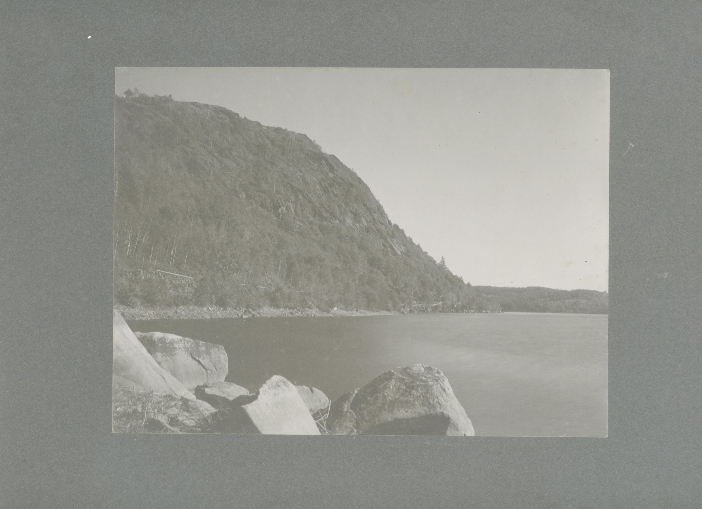 black and white photo of Megunticook Lake , also showing the Turnpike with Maiden's Cliff in the backgroundCollection