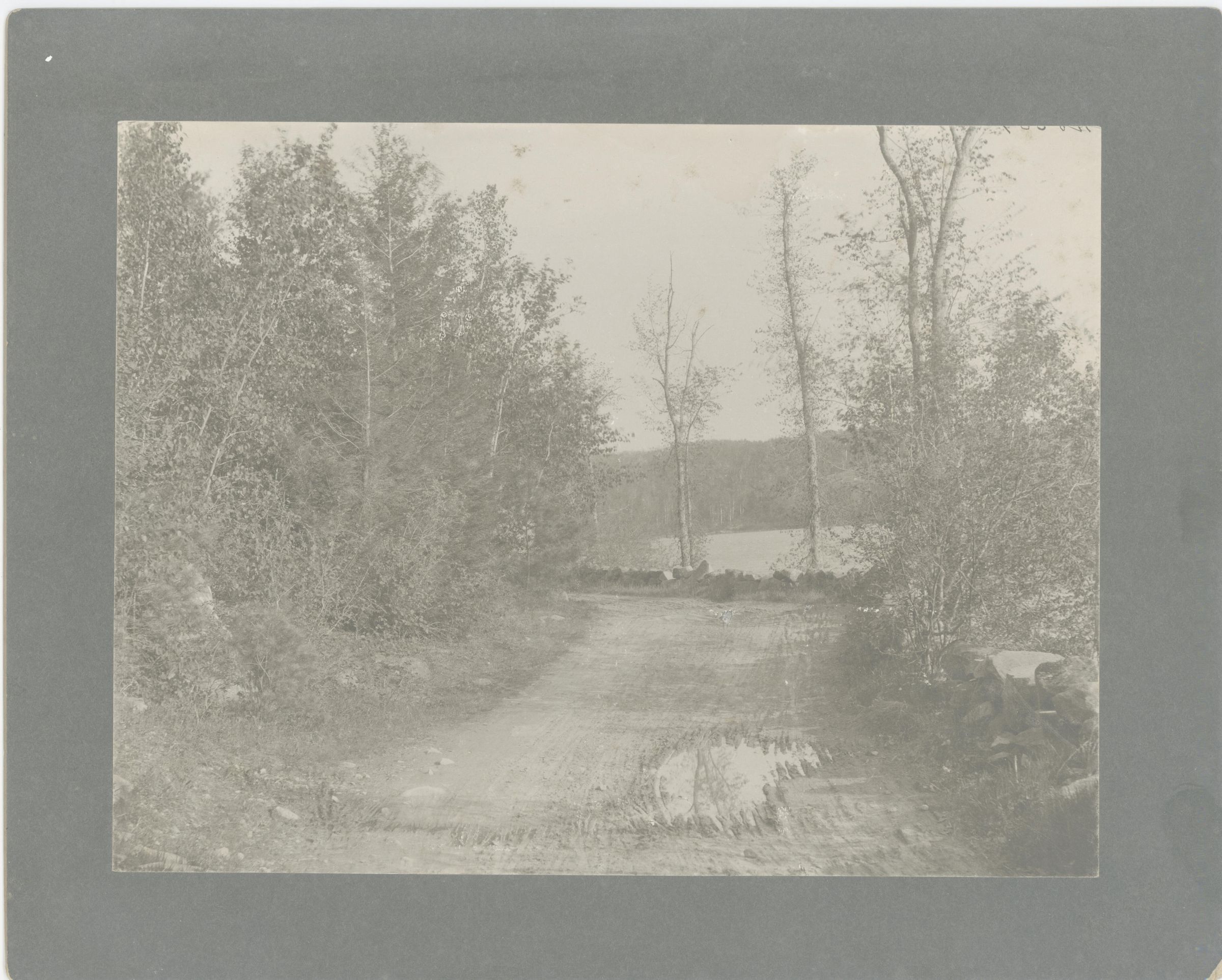 black and white photo of Turnpike Drive along the eastern edge of Megunticook Lake. The road is dirt and edged on the lake side with a stone wallCollection