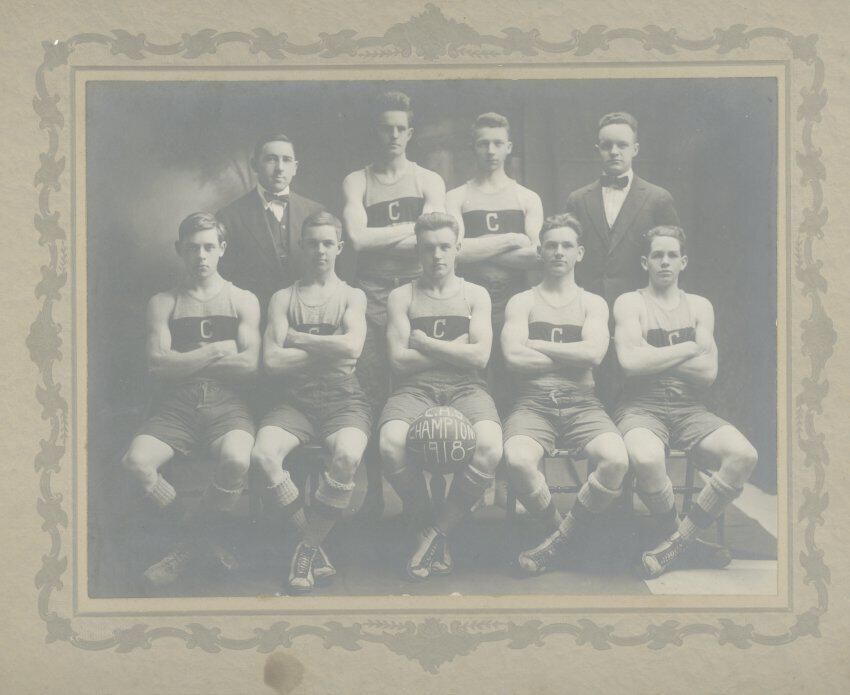 photo of the Camden HIgh School Basketball Team in 1918. On the back is written in pencil "Old Sunshine, coach"Collection