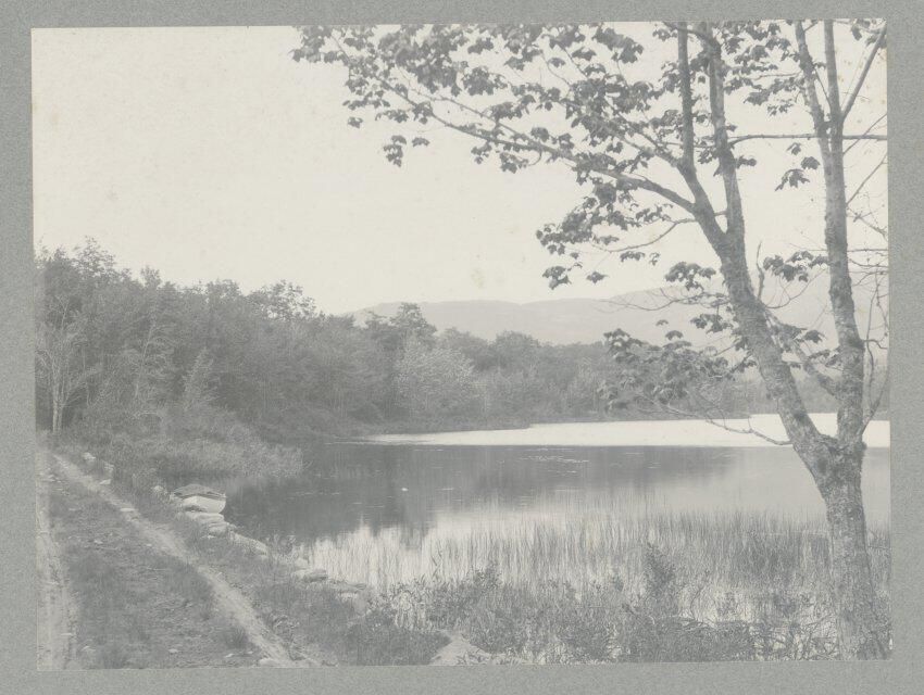 Photo taken of the dirt road near Bog Bridge. A small boat is tied up to the bridge area. Mt. Megunticook is in the background.Collection