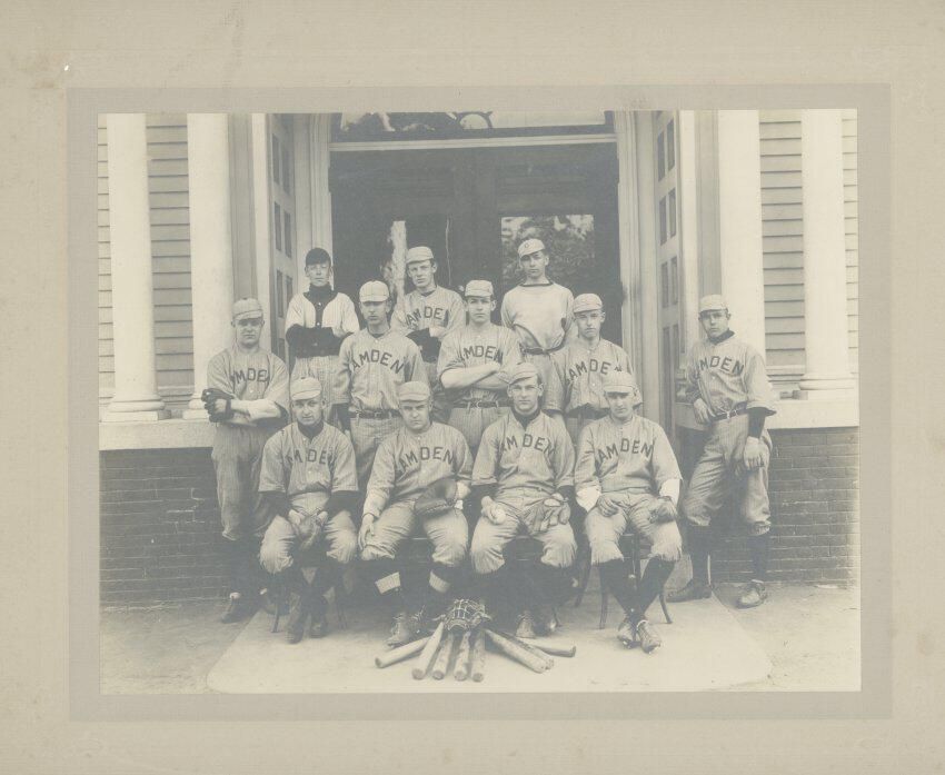black and white photo of the Camden High School baseball team taken in front of the high school? date unknownCollection