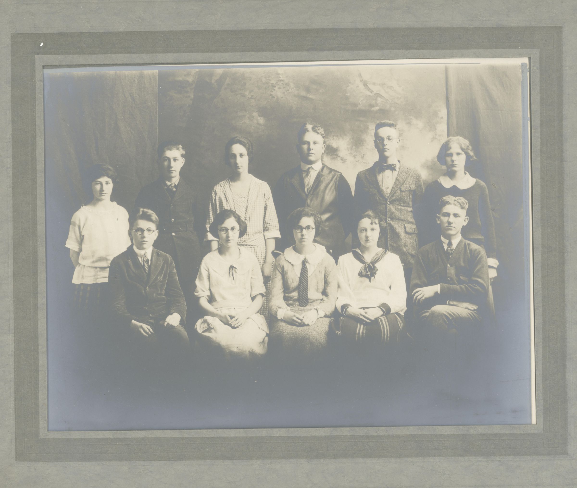 black and white photo of a group of high school students. Possible a club etc. Standing on extreme left is Isabel Ames(?)Collection