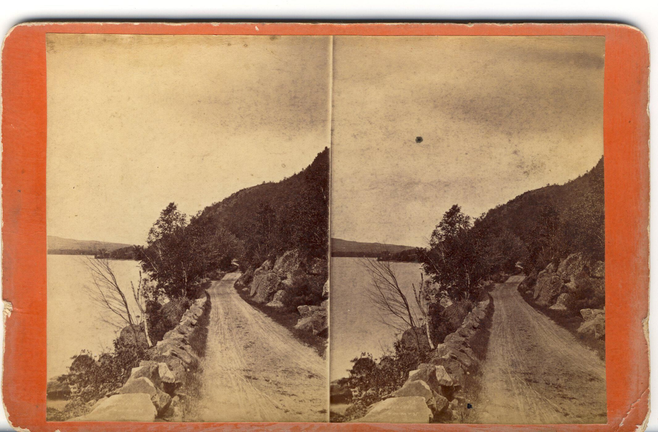 image looking north on Turnpike Drive. The road is dirt with large boulders separating the road from the lake edge. Image no. 206Collection