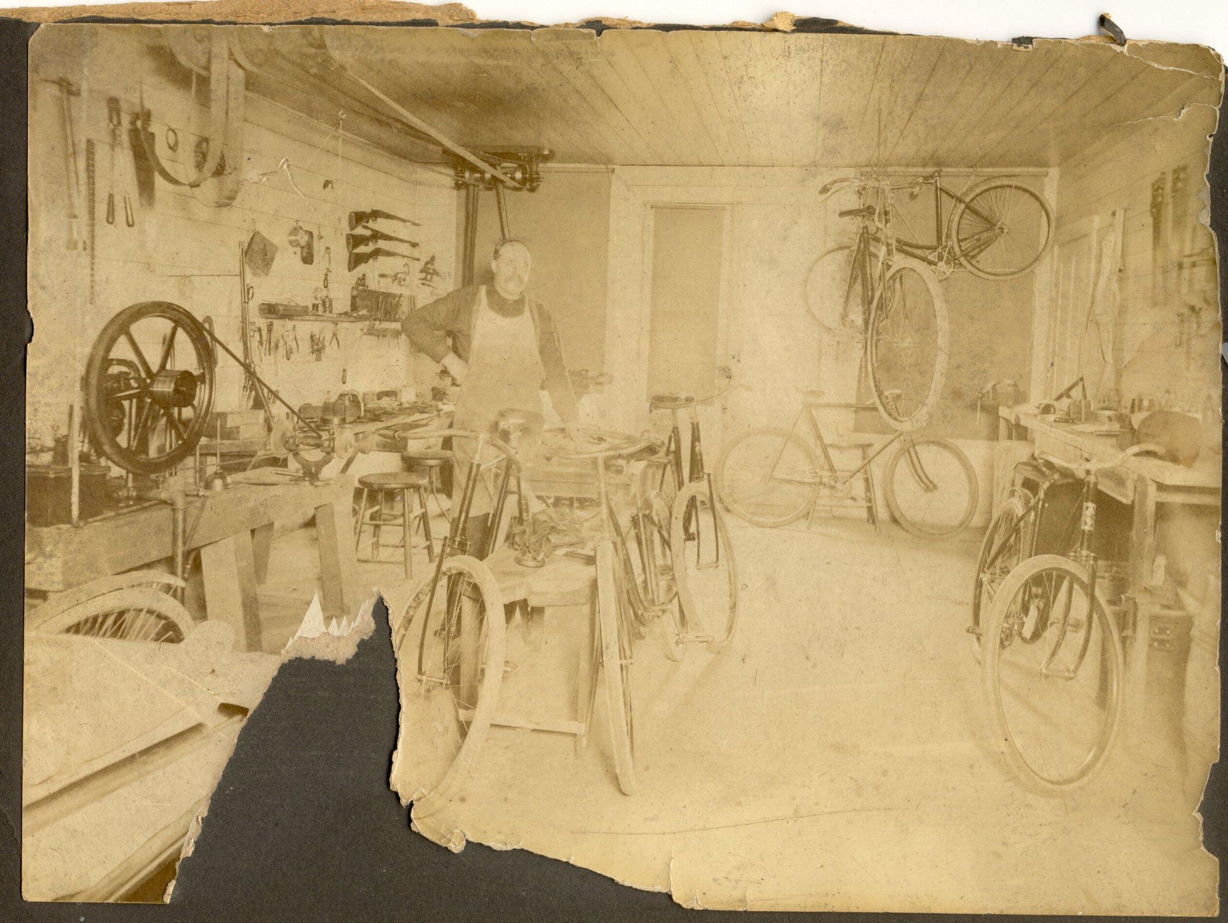 interior photo of F.M. Young's Machine and Repair Shop located on Mechanic St. in Camden. Photo shows many bicycles under repair. Man in the picture is assumed to be the owner Francis M. Young. Listed in the 1903 directory he was also a locksmith.Collection
