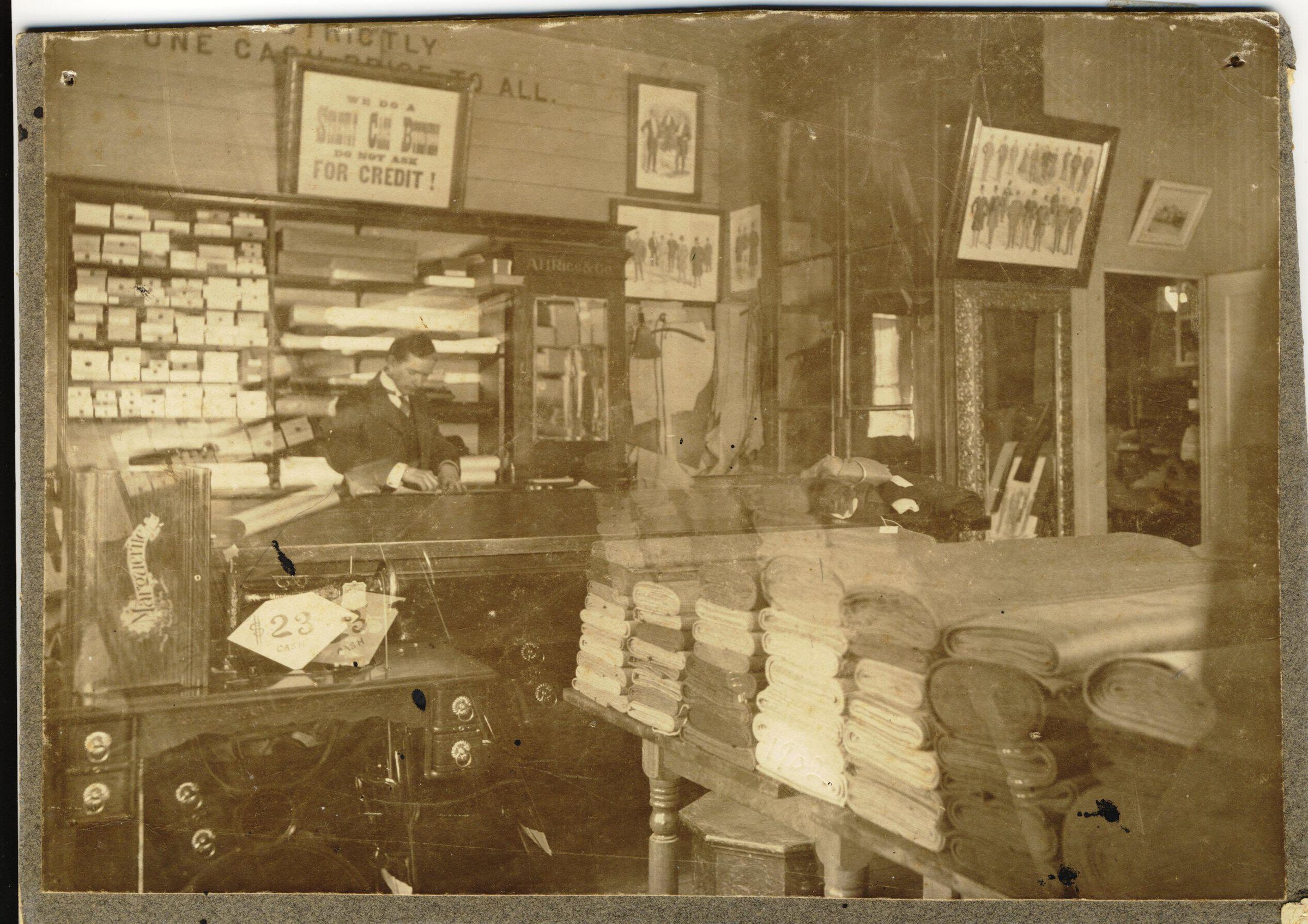 image shows the interior of Bucklin's Shop on Washington St., also known as Camden Tailoring Co. Man behind the counter is identified on the reverse as Ralph Bucklin the owner and who was the son of Charles Bucklin who was a blacksmith. Both lived on Pearl St.Collection