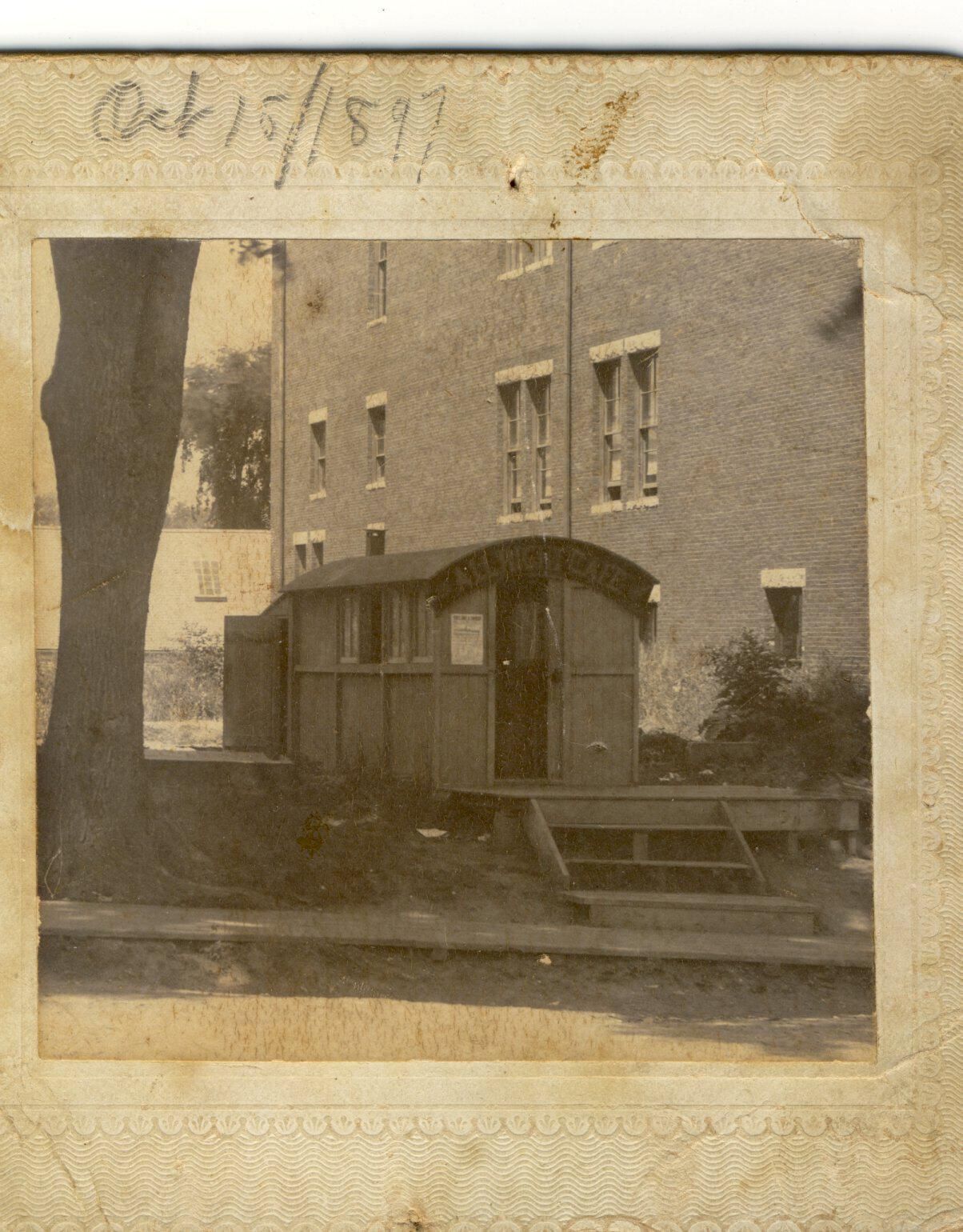 photo of a temporary style building of the All RIght Cafe identified to be on Washington St. Adjacent building looks like the Camden Opera House thus placing it on Elm St.. A wooden building later replaced this temporary structureCollection