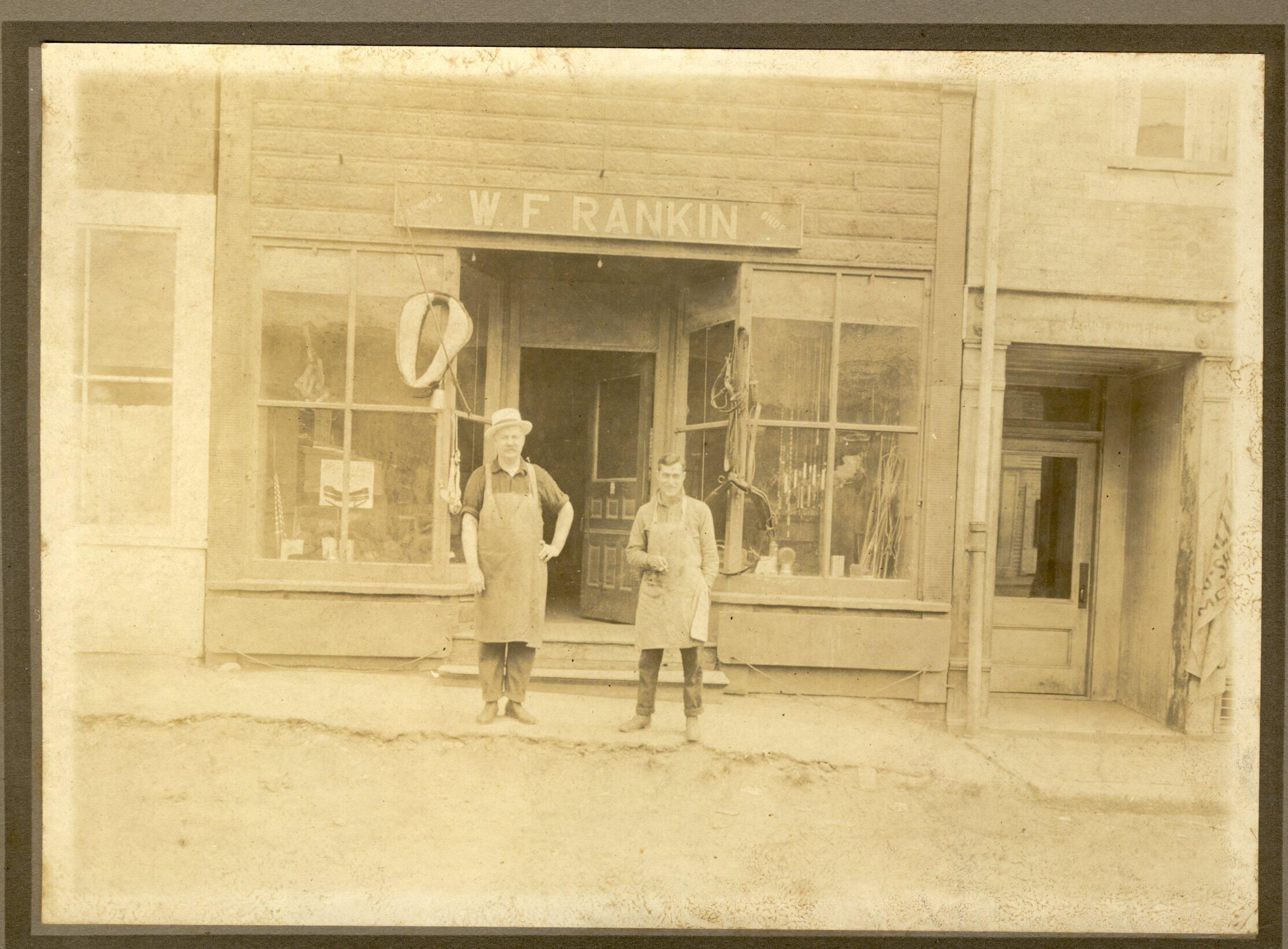exterior of the W.F. Rankin's Harness Shop on Mechanic St.. Written on the reverse is "William Rankin in front of Harness Shop, Camden--near Ski Barn, Mechanic St.. Today it would be the Planet Store-- the rear entrance on Mechanic Street.Collection